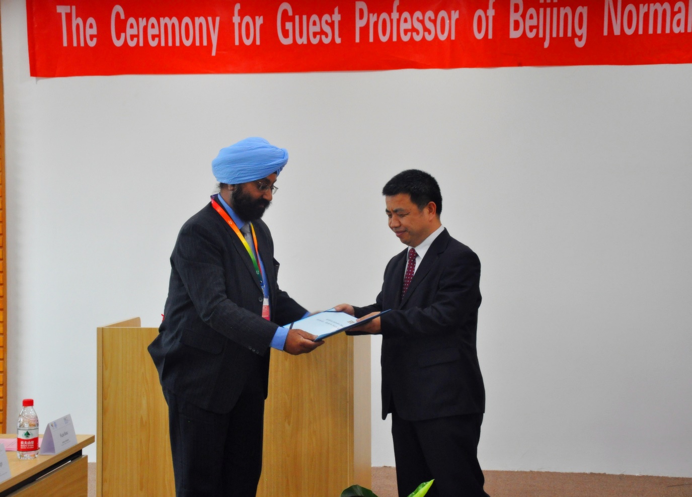 Jatinder Bir Singh, SGGCBusiness School Dean of Delhi University receiving his Guest Professor Certificate from Dean Lai Desheng