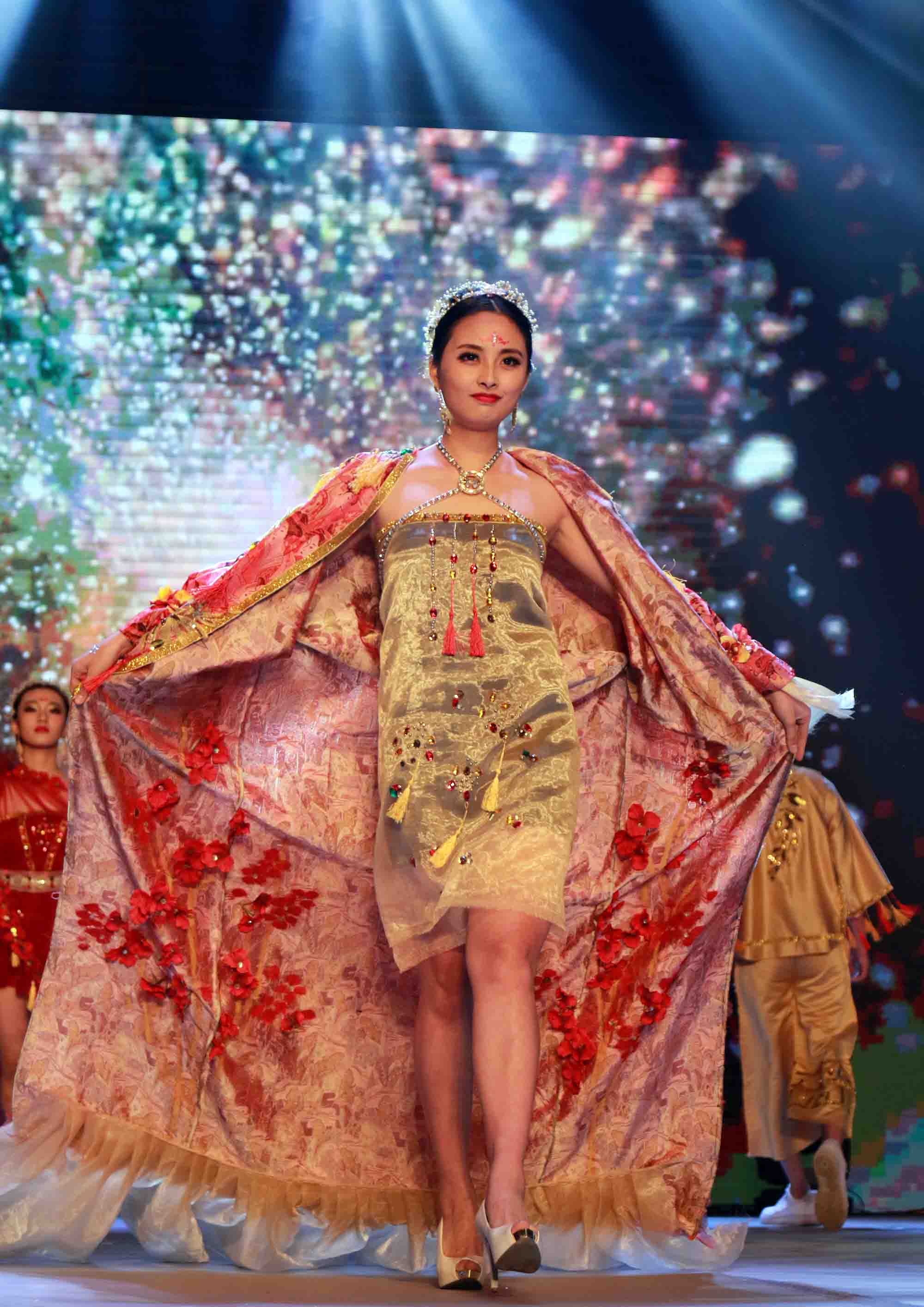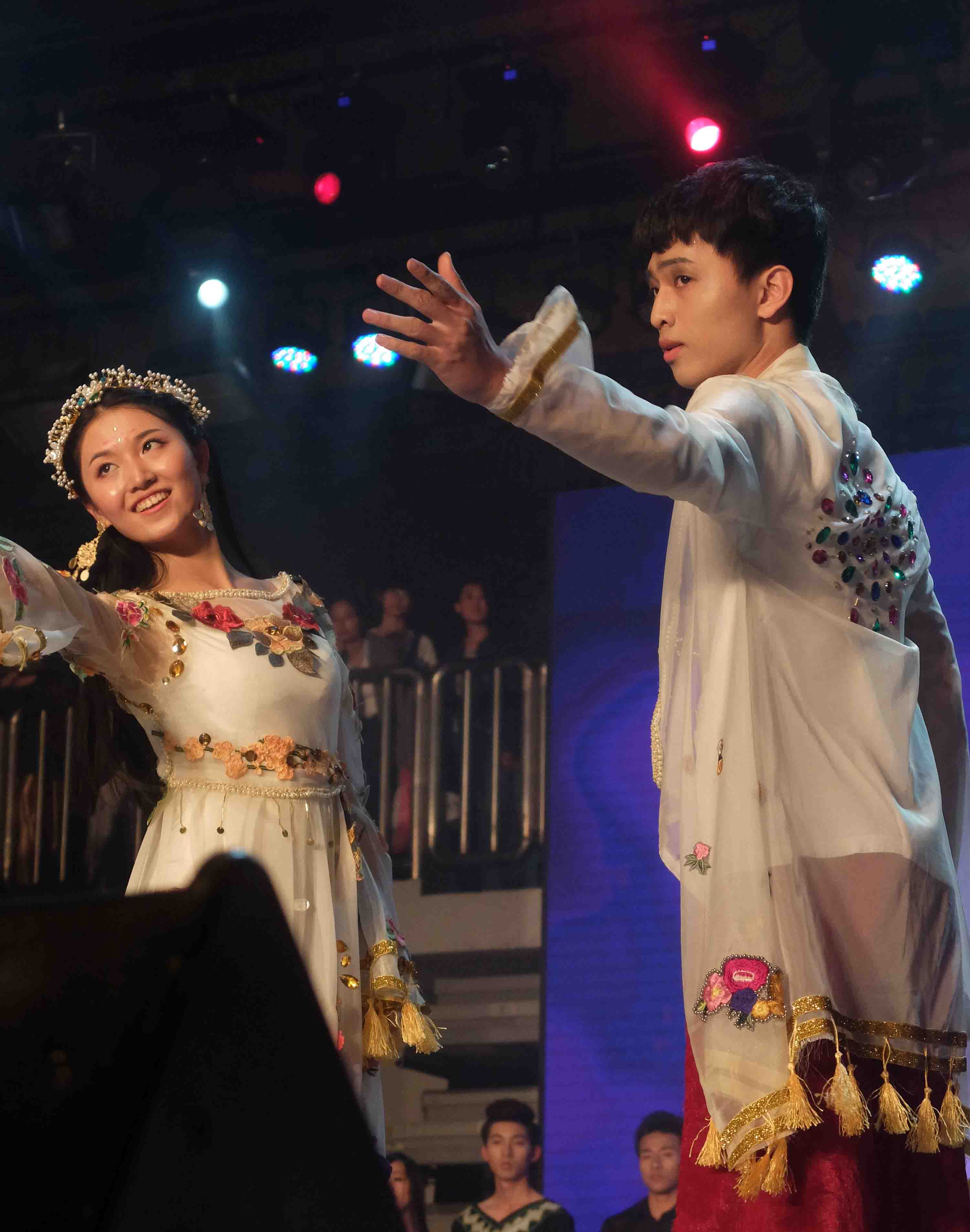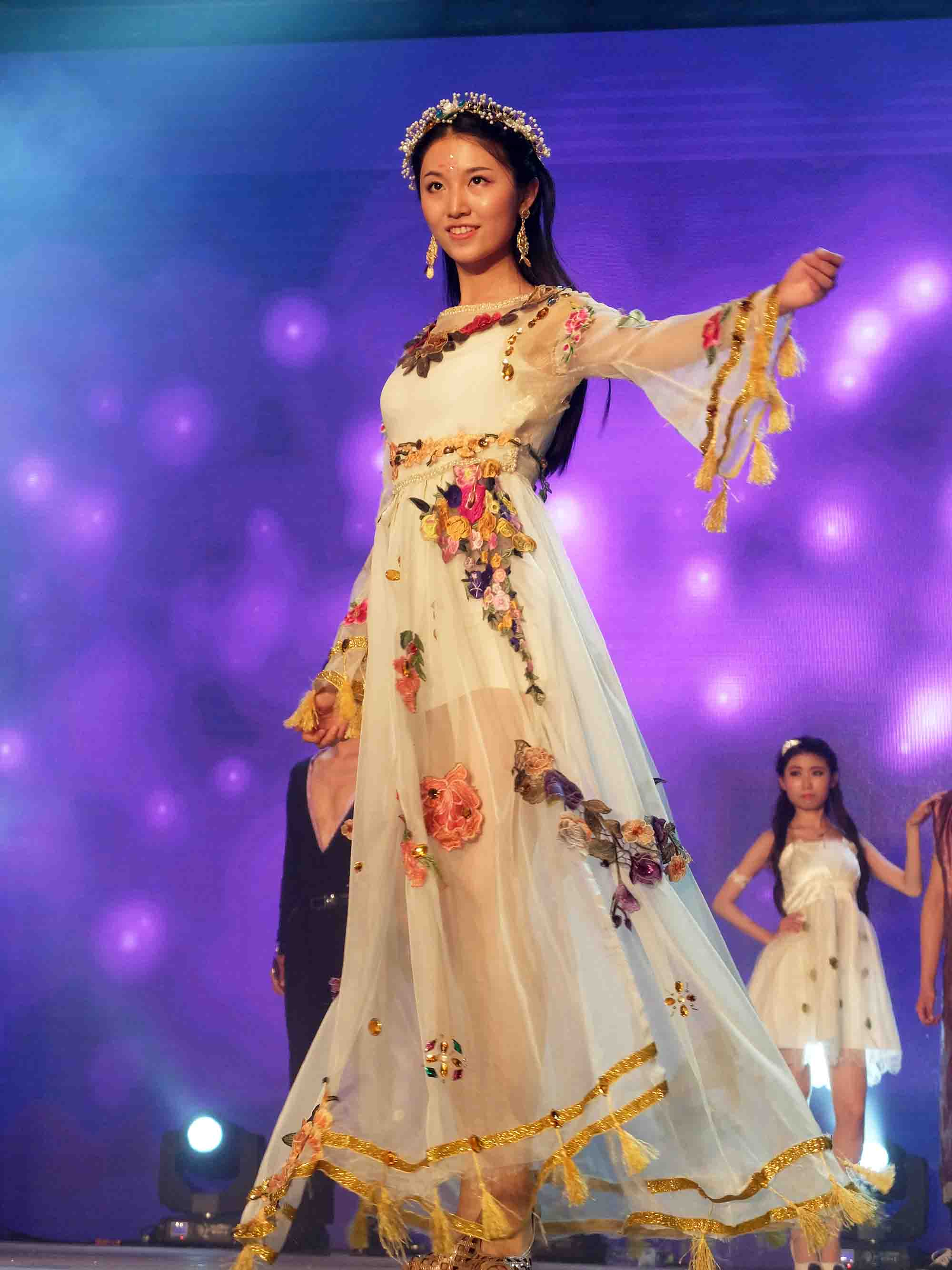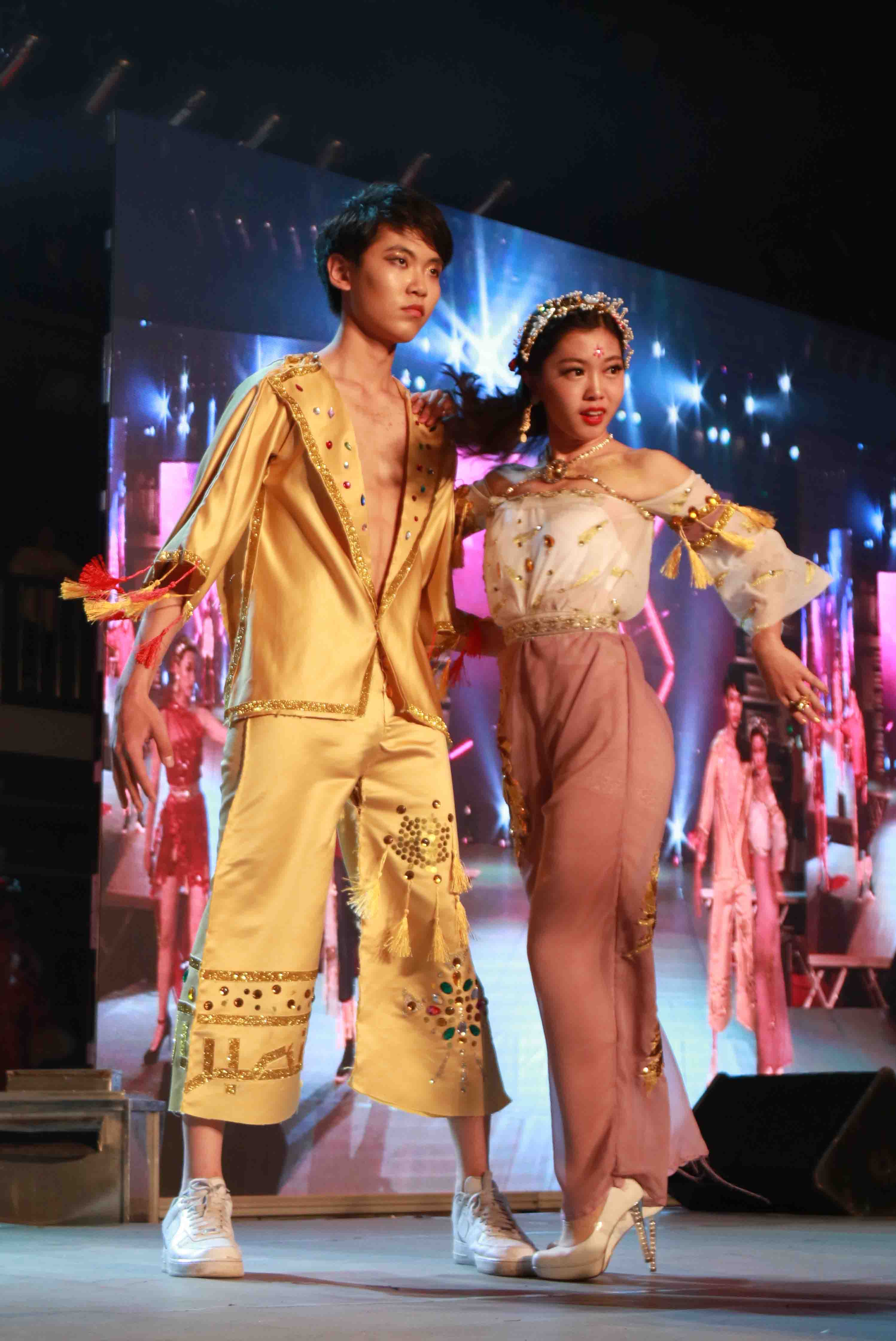 As the performances of the first two sections ended, specially invited guests Liu Liu and the Beijing Universities Street Dance Group each presented exciting performances of singing and dancing. Afterwards, as the photos changed on the background screen, the third section finally began; then it was show time for BNU Business School. Following music with a strong rhythm, the models glided onto the stage. Girls had silver headpieces and golden earrings, some wore long skirts which dragged genteelly behind them, as others wore wide-leg trousers…their elegance and beauty easily won over all audiences. Boys wore pale gold tops, and some had rose pink shawls…looking handsome and heroic. Hard work was behind every turn that they made and every costume that they wore; their efforts were definitely payed back by the passionate cheers.