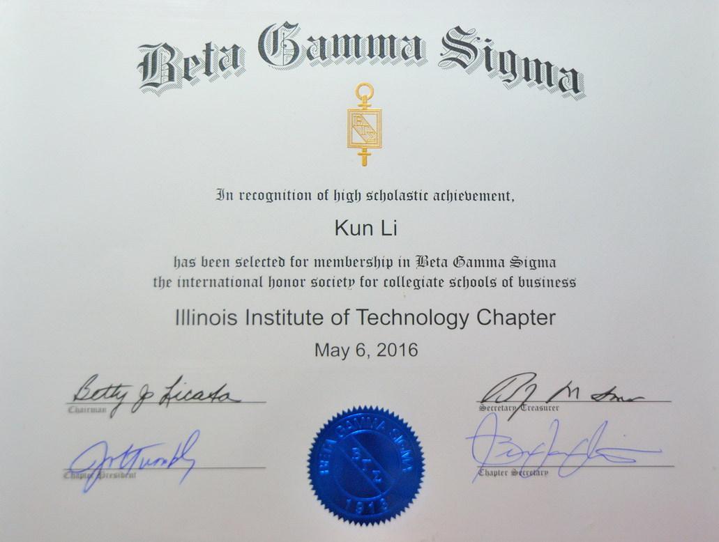 Kun Li, Assistant Professor of Finance at Beijing Normal University Business School, was awarded Beta Gamma Sigma (BGS), and inducted into the BGSInternational Honor Society. Dr. Li was invited to attend the annual BGS Induction Ceremony and receive his BGS certificate and medallion at Chicago, USA, on May 6th, 2016.