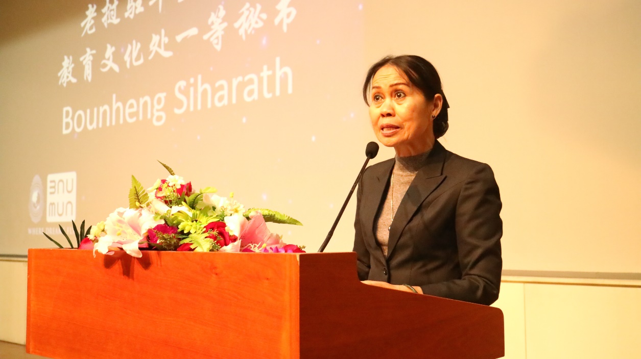 The opening speech was given by 本恒西哈拉 from the Embassy of the Lao People’s Democratic Republic, who reviewed the achievements that the UN made in the past 71 years in areas such as poverty, disease and world peace. She expressed her hopes for the young generation to pay more attention to politic affairs and see the world as a whole, to fully exercise oneself and take the first step to change the world.