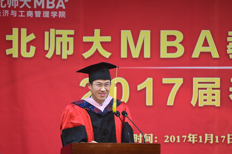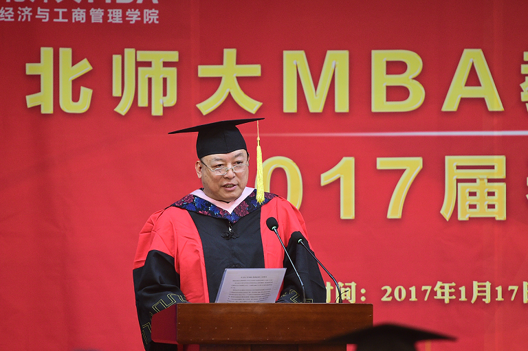 On the afternoon of January 17, 2017, in the Six Meeting Room in Jingshi Building of BNU, MBA Graduation Ceremony for Spring Class Students with the direction of Education Operation and Management was held. The participants of the ceremony include: Zhang Chi, Vice Dean of BNU Graduate School and Director of General Office, Yang Gongding, Party Secretary of Beijing Municipal Education College and and Vice Executive President of Beijing Education Party School, Yin Lijun, Secretary of Education Work Committee of Haidian District, Beijing, Fang Huaisheng, Director of the secondary vocational school teacher training center of Beijing primary and secondary schools,  Qiao Jian, Secretary of Education Work Committee of Haidian District, Du Rongzhen, Vice Secretary of Education Work Committee of Haidian District, Chen Yan, secretary assistant of Education Work Committee of Haidian District, Hu Jianguang, Director of the Organizing Section of Education Work Committee of Haidian District, Gao Yajuan, Secretary of Haidian District Education and League Work Committee, and Wang Gang, Vice President of Haidian District Education Party School, Professor Sun Zhijun, Party Secretary of BNU Business School Party Branch, Professor Cui Xuegang, Vice Dean of BNUBS, Professor Shen Yue, doctoral supervisor of Department of Economics, Professor Yuan Liansheng, doctoral supervisor of Department of Accounting, Professor Li Baoyuan, doctoral supervisor of Department of Human Resources Management, Professor Li You, doctoral supervisor of Department of Department of Economics, Jiao Hao, Zhang Quilan, Zhou Jianghua, vice directors of MBA Education Center, Du Jing, director assistant, and Wang Lulu, Zhang Li, Su Xiaoyuan and other teachers of the MBA Education Center, and 76 graduates. The ceremony is chaired by Vice Dean Cui Xuegang.