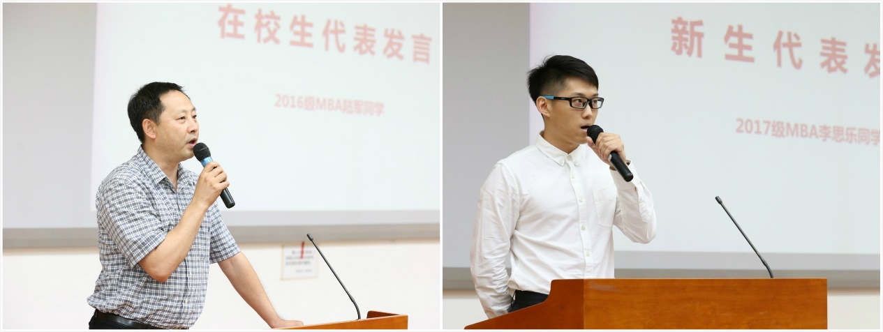 Student representative Lu Jun from 2016 MBA and Li Sile from 2017 MBA gave remarks on behalf of their peers. Lu concluded five advise for new joiners in his talk which are integrity, diligence, helpful, inclusiveness and belief. Li expressed his excitement of getting back to campus life. He felt proud and responsible, and is looking forward to future study!