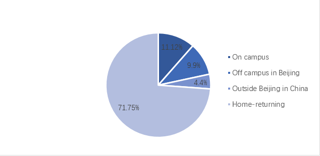 As of February 2020, there are 95 international students enrolled in BNUBS. At the beginning of the epidemic, when the fall semester of 2019 came to an end, more than 30 newly registered international students of our school just left the country. Among the 95 international students, 11 students were staying in the school, 9 students were living outside the campus, and 4 were in other Chinese cities, 71 people returned to their home country (Shown in Pie Chart 3). After the outbreak of epidemic, on January 27, a document was issued by BNU to canvass all students and notify each student of the epidemic. On the same day, the Chinese and English version of the epidemic prevention and control system for all teachers and students of Beijing Normal University was launched. Every international student was required to report their situation as the Chinese students did. At the beginning of this work, BNUBS set up an emergency working group for international students’ management. The associate Dean in charge of international exchange and cooperation affairs served as the group leader. The Director of the BNU Office of International Exchange and Cooperation Information were responsible for collecting and summarizing the information submitted by head teachers of international students and administer of exchange students, as well as reporting the daily situation of international students. The head teachers of international students were assigned to maintained liaison with each international student. Since the international students usually would arrange their own journey at the end of each semester, the students had been distributed around the world when the epidemic occurred. As a result, the contact means for the head teachers to contact with the international students were mainly via telephone, email and WeChat. With the efforts of the working group, the college has contacted 95% of the international students, notified them the domestic epidemic situation and the requirement that BNU temporarily not allow students to return to school. The proportion of students filling in the daily report also reached 93% (February 15, 2020). The epidemic prevention and control reporting system helps the school and the university to know students’ situation in real time. For students who reported malaise or fever, their head teachers had made a one-to-one contact, urging students to pay close attention and seek medical treatment as soon as possible. During this period, two students from Business School returned to Beijing from other Chinese cities. The two students were arranged to live in the Changping Campus of Beijing Normal University for a 14-day quarantine observation. At present, they have returned to the main campus of BNU with the end of their quarantine observation. With the development of the epidemic, on February 11, 2020, Beijing Normal University issued its arrangements in a document again, which required all students not to return to school. As to students living on campus, they should stay in the dormitory as much as possible, and the University would be managed in a lockdown manner. On February 13, 2020, in accordance with the requirements of the Ministry of Education and the Beijing Municipal Commission of Education, BNU delayed the start date next semester openly, implemented online teaching and online administrative office. Therefore, BNUBS required once again that all international students to reschedule or refund tickets purchased for return to Beijing, and the start date will be decided and notified in accordance with the epidemic situation.