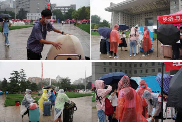 Even the rain didn’t stop their work. Volunteers wore raincoats and escorted new students to dormitory buildings for registration.