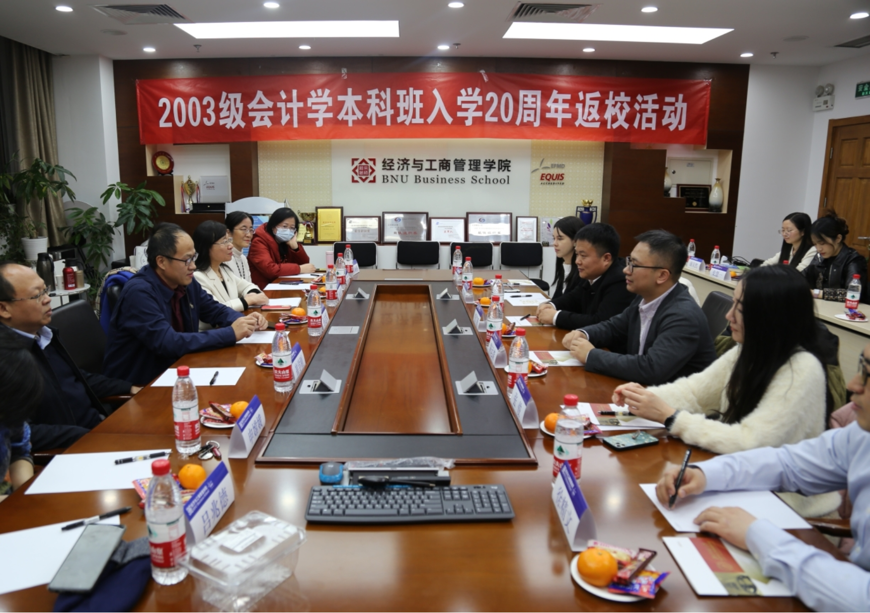 On December 6, 2023, BNUBS successfully held the alumni symposium of the Department of Accounting in the Rear Main Building 1722. The alumni representatives of the Accounting undergraduate class of 2003, the teacher representatives of the Accounting department, the teacher of the Aumni Office of the School, and the student representatives of the Accounting Department participated in the activity. The symposium was presided over by Mr. Wu Qinhong, the Director of the Accounting Department, and Professor Sun Zhijun, the Party Secretary of BNUBS, attended the activity.