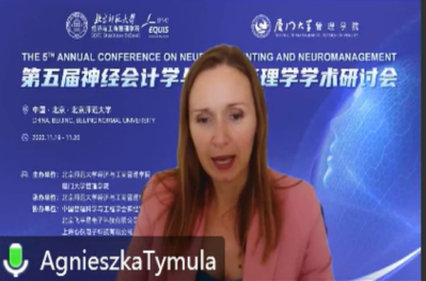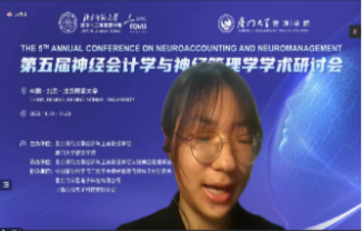 The speakers on the morning of the 19th include Prof. Kuang Xi, Georgia Institute of Technology, USA; Prof. Agnieszka Tymula, University of Sydney, Australia; Prof. Yuzhen Liu, Peking University; Prof. Yu Pan, Shanghai International Studies University; and Prof. Chao Liu, Beijing Normal University. The keynote speeches were hosted by Tang Honghong from Beijing Normal University and Chen Yasheng from Xiamen University. The topic of professor Kuang Xi’s speech was Behavioral Accounting Research in the New Era. He built a theoretical framework of behavioral accounting research, based on which he introduced the latest achievements of behavioral accounting research in the fields of social media, social responsibility, remote work and mobile communication, and predicted the future direction of behavioral accounting research. Professor Agnieszka Tymula from the University of Sydney in Australia made a report titled Gender Differences in Risk Attitudes from the perspective of Neuroeconomics. She introduced the phenomenon that women are more risk averse than men. Through systematic research, she found that the difference in risk attitudes between men and women is due to the actual inequality of women in society. Differences in risk attitudes between men and women could be reduced by increasing equality between men and women in societies or by providing better information. From the perspective theory and psychological accounting, Professor Liu Yuzhen from Peking University introduced the types of behavioral bias and the ways to correct them, as well as the importance of understanding investor decision-making. At the same time, he pointed out the significance of commercialization of behavioral science and the importance of investor education through behavioral finance and neurofinance to achieve common prosperity. The topic of Professor Pan Yu's speech was Exploration and Research on brain-computer collaborative information behavior. He introduced information behavior, the application of neuroscience in information behavior in the context of management science and the research development of brain-computer collaborative information behavior, and expected to use multiple research methods to explain the regular mechanism and scientific paradigm of information behavior in the environment of multiple intelligences in the future. The topic of Professor Liu Chao's speech from Beijing Normal University is Social Navigation: How Spatial Codes Support Navigating in the Abstract Social Space , the latest research results demonstrate that virtual (interpersonal) space navigates in the same neural mechanism as physical space and conceptual space.