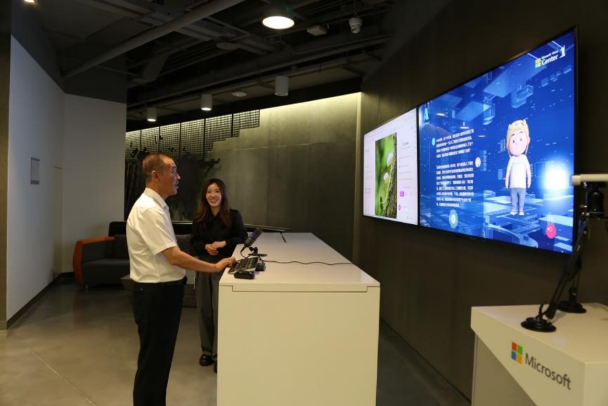 Finally, the docents led the teachers and students of the School to visit the Microsoft China Center One exhibition hall, and combined with the visual language displayed by the intelligent screen of the exhibition hall, introduced the cutting-edge technological breakthroughs made by Microsoft in recent years, and the industrial layout of the company in artificial intelligence, cloud computing and mixed reality.The exhibition hall has a number of creative interactive scenes, vividly showing the specific application of future technology, including that teachers and students interacted with ChatGPT Hudon voice and felt the powerful computing understanding of Microsoft's big language model in the creation of wonderful stories and human-computer questions and answers; Teachers and students experienced the latest technology of Microsoft speech synthesis, and brought the "Diary of a Madman" fragment recitation in multiple languages; In the process of trying on Microsoft's self-developed Hololens holographic glasses, teachers and students experienced the sense of technology combined with the virtual digital world and real life scenes. The exhibition hall took the intelligent building management of the headquarters building as an example, and displayed real-time information such as air quality and equipment operation through real-time monitoring and automatic analysis system to achieve sustainable operation and optimal environmental control.
