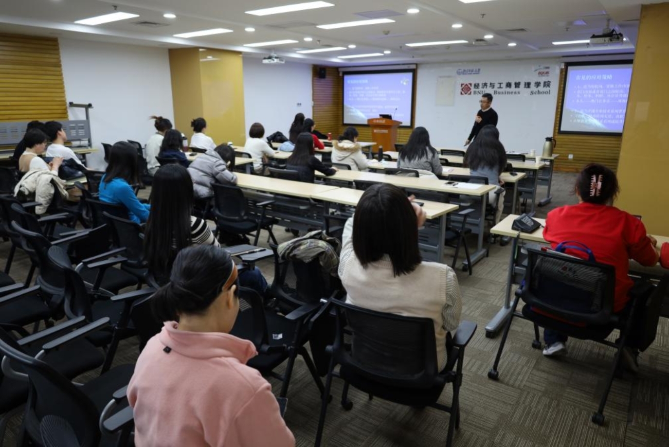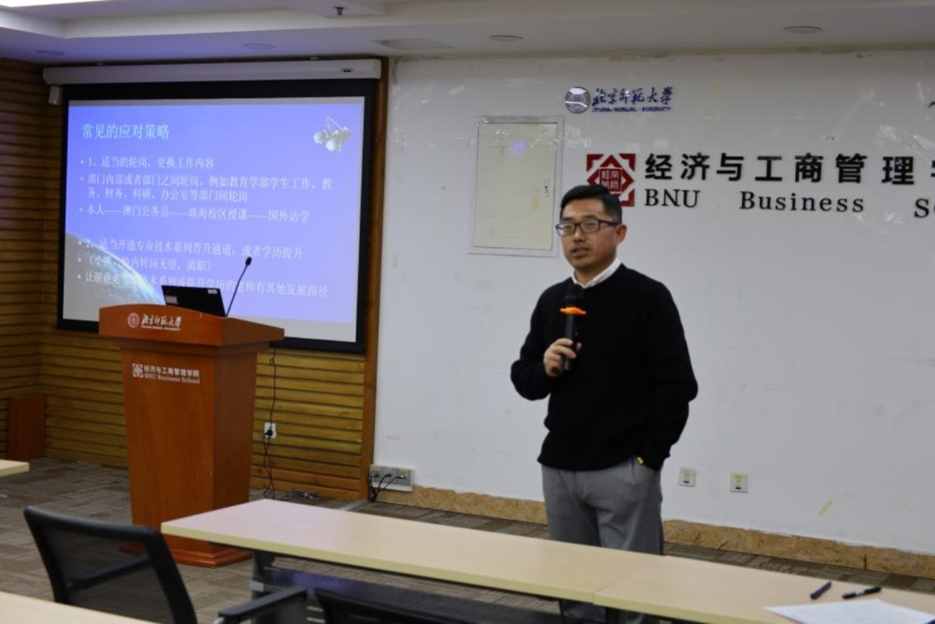 In order to deepen the participants' understanding of organizational management and communication skills, BNUBS organized a special lecture in Room 9406 of the JINGSHI Building on the afternoon of January 4. The lecture was presided over by Han Lili, AssociateSecretary of the Party Committee of the School, and Xu Zhixing, director of the Department of Human Resources Management of the School, was invited to give a lecture. The theme of the lecture was "Organization Management and Communication Power", and the administrative teachers participated actively to discuss the new ideas of communication strategy in administrative management.