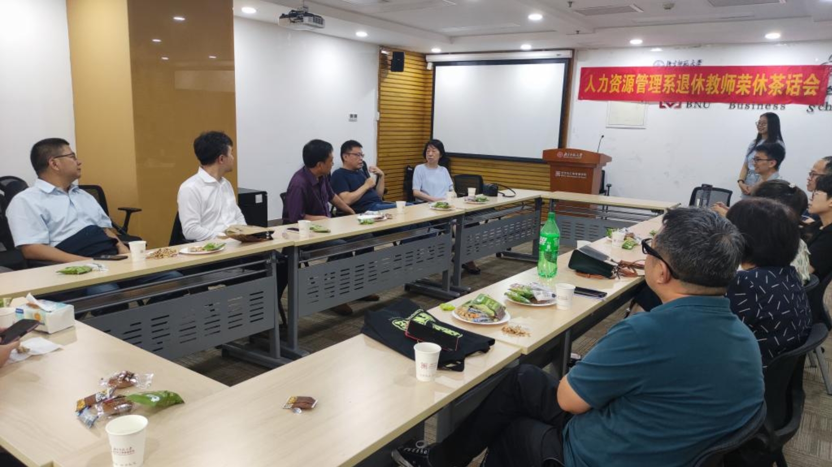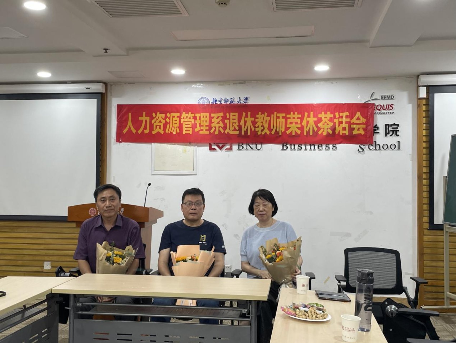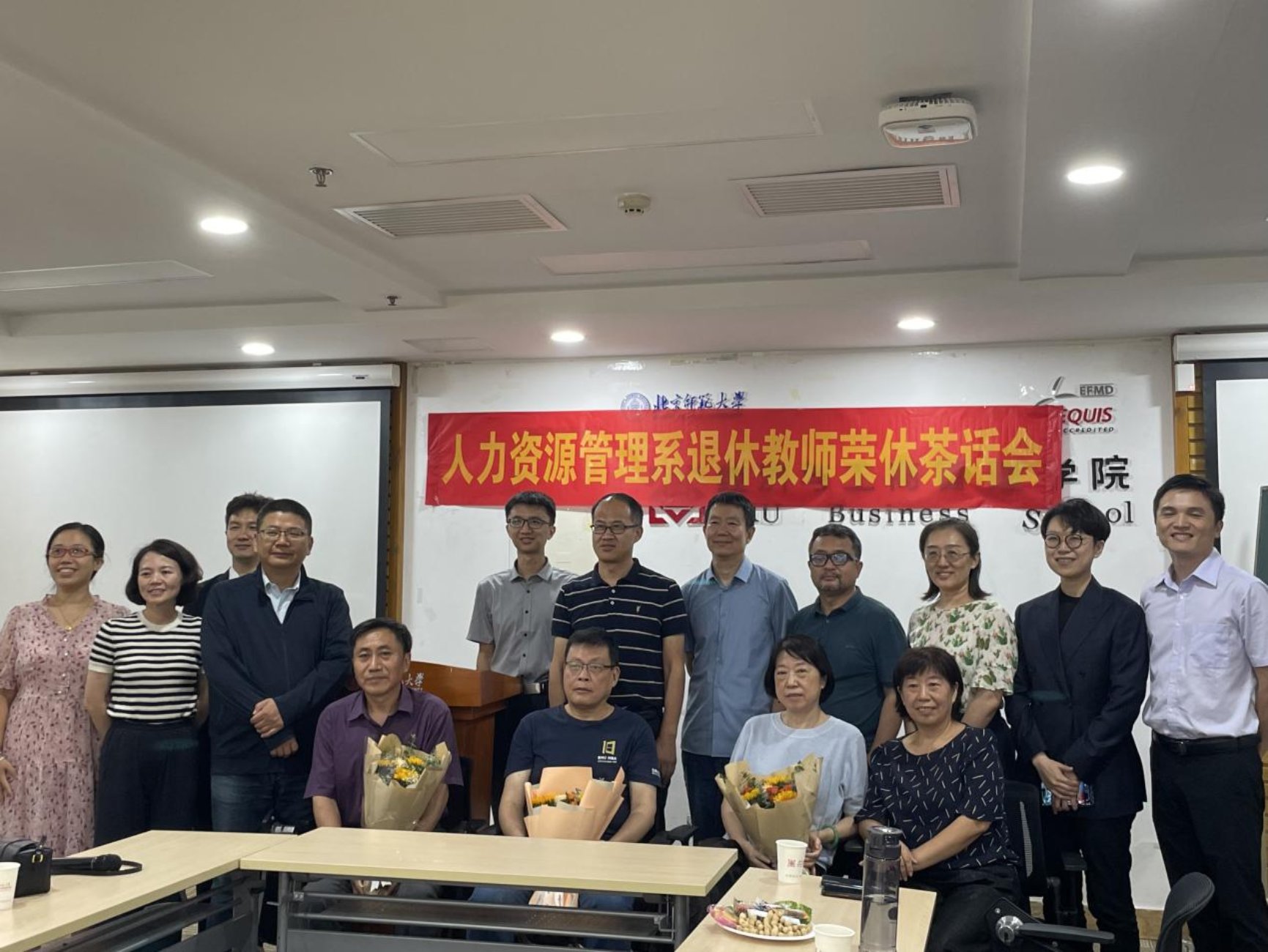 After the three old teachers shared their feelings with each other, the student representatives of Human Resources Department presented flowers and gifts to the three teachers, wishing them good health and a happy life after retirement. A bunch of flowers expressed their gratitude to the three teachers for many years. They practiced the motto of “Learn, so as to instruct others; Act, to serve as example to all" with their youthful blood. They won high recognition from the students with their ingenuity and sincerity. It is hoped that they will not fade after retirement, continue to pay attention to and support the work of the department, and actively offer suggestions for the development of BNU and the School. After the ceremony, three retired teachers took a group photo.