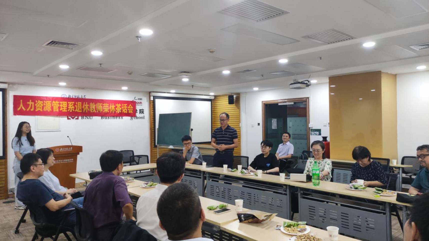 At the meeting, the three teachers delivered their retirement speeches respectively. For decades, they have always been dedicated and down-to-earth, dedicating their best youth to the cause of education in the motherland, and contributing their own strength to the development of the School. Mr. Zhang Yue told about his teaching career in Beijing Normal University, recalled every bit of his work in the School, and expressed his gratitude to the School. Mr. Li Baoyuan shared his interesting lesson preparation when he was the main teacher of Advertising Science, and shared his past experience in teaching with vivid humor. Ms. Chen Yan also recalled her first arrival in BNU and encouraged the new generation of young teachers in the School with her teacher's message to her. The atmosphere of the venue was warm and harmonious and the room was filled with happy laughters and cheerful voices.