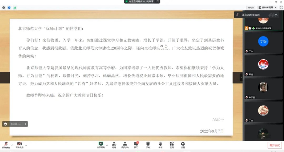 随后,秦瑞仪同学详细介绍了习近平总书记的回信内容,在她的介绍中我们感受到了习近平总书记对永利集团广大师生的祝贺和问候,与对“优师计划”师范生以及全体青年学子的殷切期望。