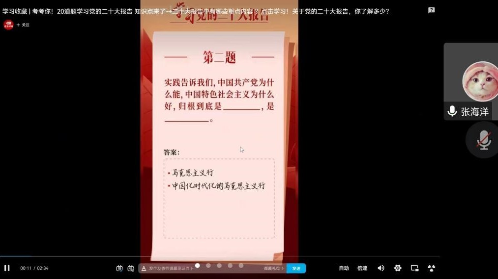 在团支书张海洋同学的带领下,大家集体观看了专题片《参数》,并通过互动答题的方式集体学习了党的二十大报告的重点内容。支部成员结合自身学习、工作和生活实际,从不同层面、不同角度分享了自己的学习心得体会。