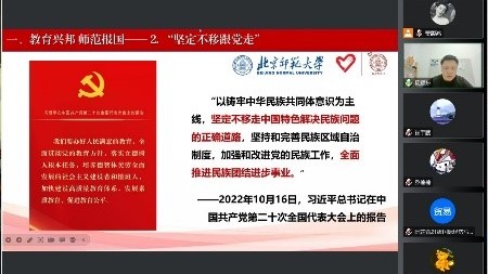 随后,杨耀东同学带来了“石榴红与师大蓝的美好遇见”主题宣讲。他将党的二十大精神与自己的亲身经历相结合,鼓励同学们将党的二十大精神落到实处,要发扬自力更生、吃苦耐劳的精神,持之以恒地学习,以更高的文化素养投身于全面建设社会主义现代化国家的实践中;要志存高远,树立为人民永久奋斗、赤诚奉献的坚定理想;要在科技攻关最前沿、创新创业第一线、乡村振兴主战场、社会服务各领域中用有限的生命创造出无限的价值。