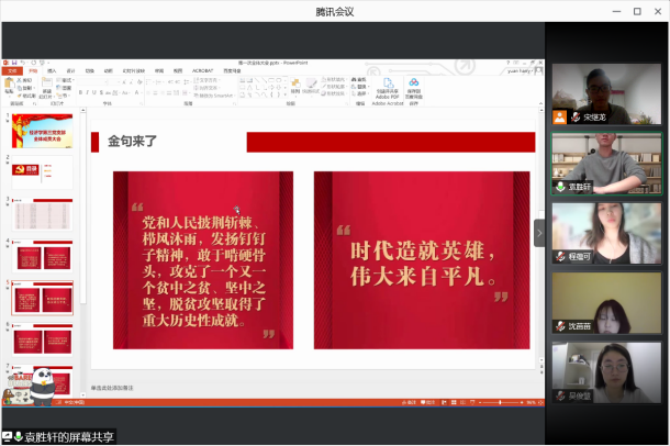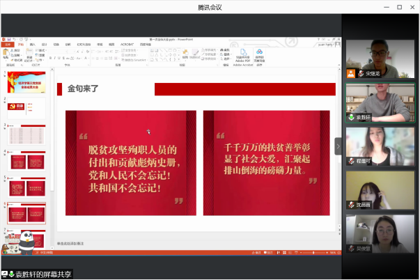 颜迪同学分享了自身与驻村干部的接触经历,肯定了脱贫攻坚战中这些驻村干部做出的贡献,另外还指出中国在脱贫攻坚战上的胜利为世界脱贫事业做出了贡献重大贡献。吴俊慧同学谈到,伟大的扶贫成果离不开可敬的扶贫干部。他们奔赴在脱贫攻坚的路上,步履匆匆,挨家挨户摸查情况建档案;劳碌于乡村致富路上,殚精竭虑,建立集体合作社增产增收。还指出人生的意义在于投入到无限的为人民服务中。王韫玮同学指出应学习脱贫攻坚战中团结和实事求是的精神,并将其应用在日常学习生活中——实事求是,学真知,出真知。