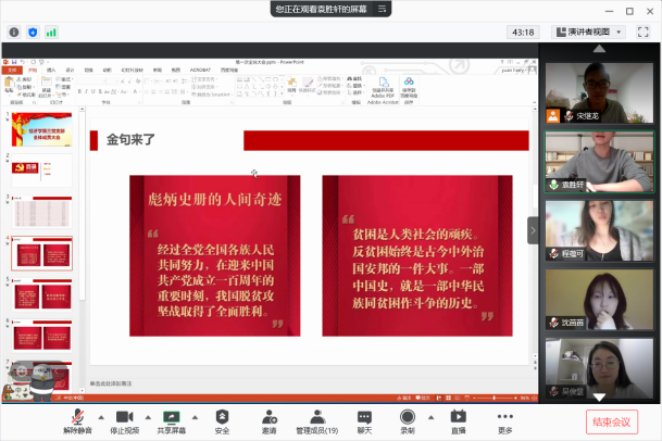 安露露同学分享了自身在贫困县农村的成长经历,谈到自己能够深刻地体会到贫困村脱贫后的巨大变化,并指出脱贫攻坚的伟大成就离不开中国共产党的伟大领导和人民和全国人民的巨大凝聚力。攻坚脱贫永远在路上,绝对贫困的消除只是一次阶段性的胜利,仍然需要继续努力。孙婧婷同学指出虽然因为没能参与到整个脱贫攻坚的过程中来而感到遗憾,但认为只要坚持脚踏实地,在未来就一定能够在全面建设社会主义现代化国家的进程中贡献自己的力量。左佳弘同学指出我国消除了绝对贫困,让青年一代对中国特色社会主义现代化的建设充满信心,要始终铭记奋斗在脱贫第一线的同胞们,努力学习他们的精神,为党和人民服务。陈瑶同学表示我国在脱贫方面作出的贡献是突破性的,但与此同时,当下目标的达成并不意味着可以松懈,身为入党积极分子应当脚踏实地,提高自身水平,投入到巩固脱贫成果的工作当中去。姬静怡同学表示脱贫攻坚任务的完成不是终点,而是新生活的起点,要把精准扶贫的工作精神延伸到乡村振兴的工作中来,继续为人民服务,为乡村谋发展,把乡村建设得更好。