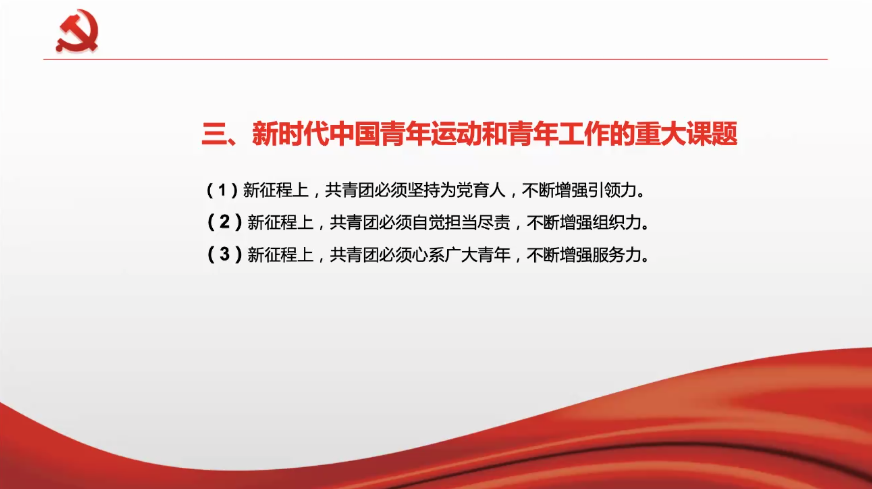 随后,来自国际贸易第一党支部的詹俊岩同志带领支部成员一起学习了习近平总书记在庆祝中国共产主义青年团成立一百周年大会上的讲话,指出了此次讲话是新时代党的青年工作纲领性文件,充分肯定了共青团在党领导的中国青年运动壮阔进程中的先锋队作用,深入论述了新时代中国青年运动和青年工作团结、组织、动员青年为实现第二个百年奋斗目标、实现中华民族伟大复兴的中国梦而奋斗的重大课题。面对严峻的抗疫形势,詹俊岩同志提出要充分发挥党支部战斗堡垒作用和党员先锋模范作用,扛起疫情防控的使命担当,筑牢疫情防控的战斗堡垒,勇当疫情防控的先锋榜样。