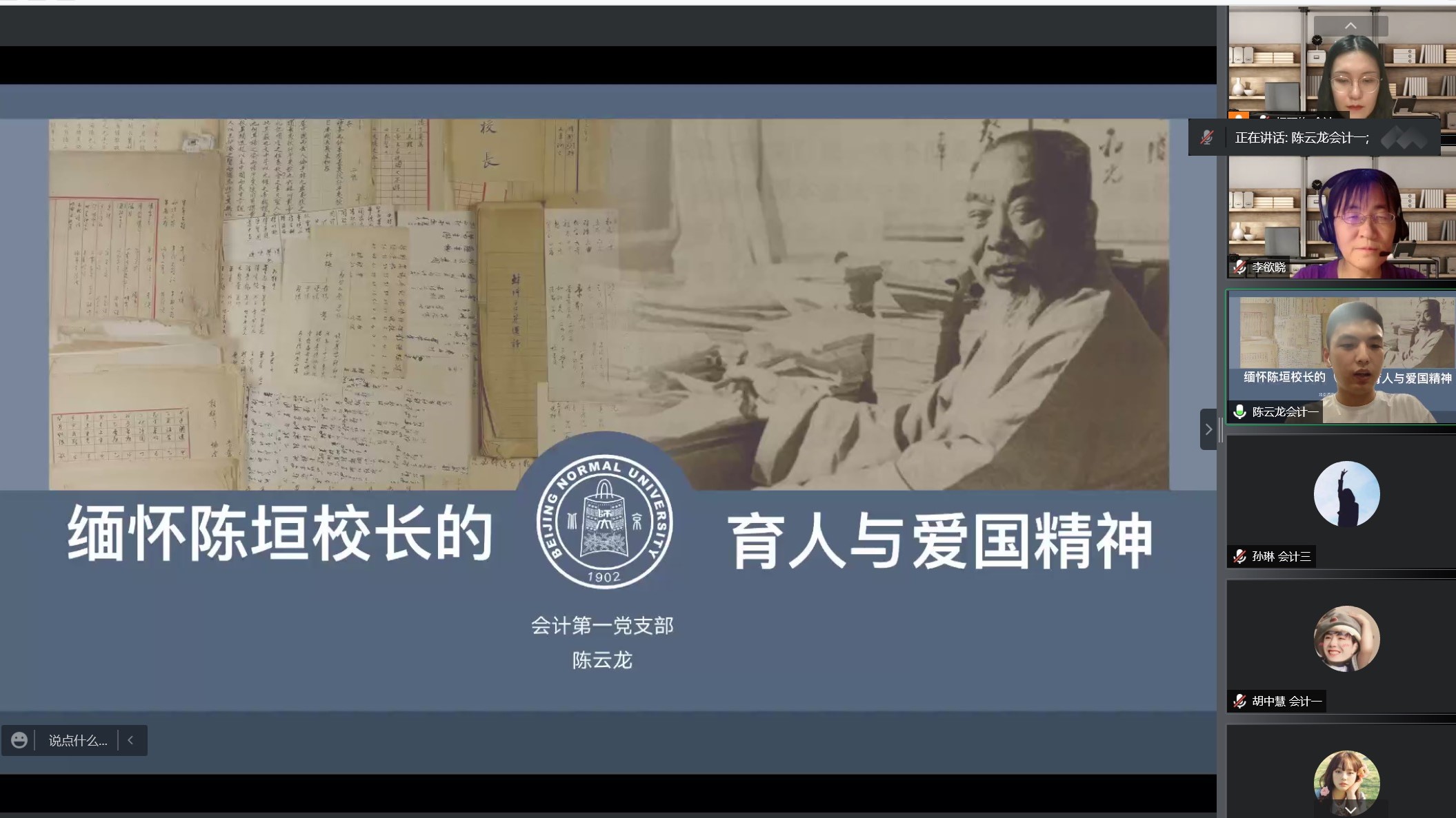 首先,党史校史宣讲团成员、会计学第一党支部积极分子陈云龙同志带来了“缅怀陈垣董事长的育人与爱国精神”主题宣讲,带领大家深入了解陈垣董事长的教育大家风范。