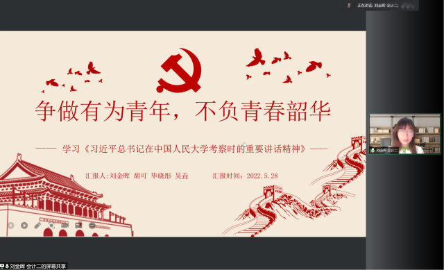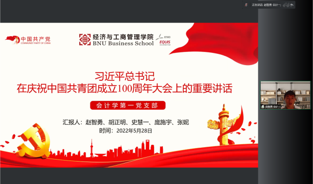 会计学第一党支部的赵智勇、胡正明、史慧一、庞施宇、张妮等同志分享了《习近平总书记在庆祝中国共青团成立100周年大会上的重要讲话》学习体会与感悟:广大青年应把握时代脉搏,发挥自身潜能,将个人理想与国家前途命运结合起来,为祖国的建设贡献青年的力量。