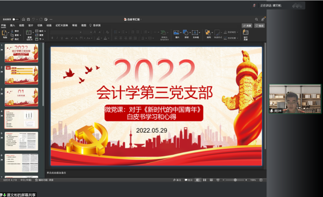 会计学第三党支部谭文彬同志带领大家共同学习了《新时代的中国青年》白皮书。在多元化的时代与机遇中,青年人更应当积极承担责任,履行应尽义务,构建新时代新青年的世界观。