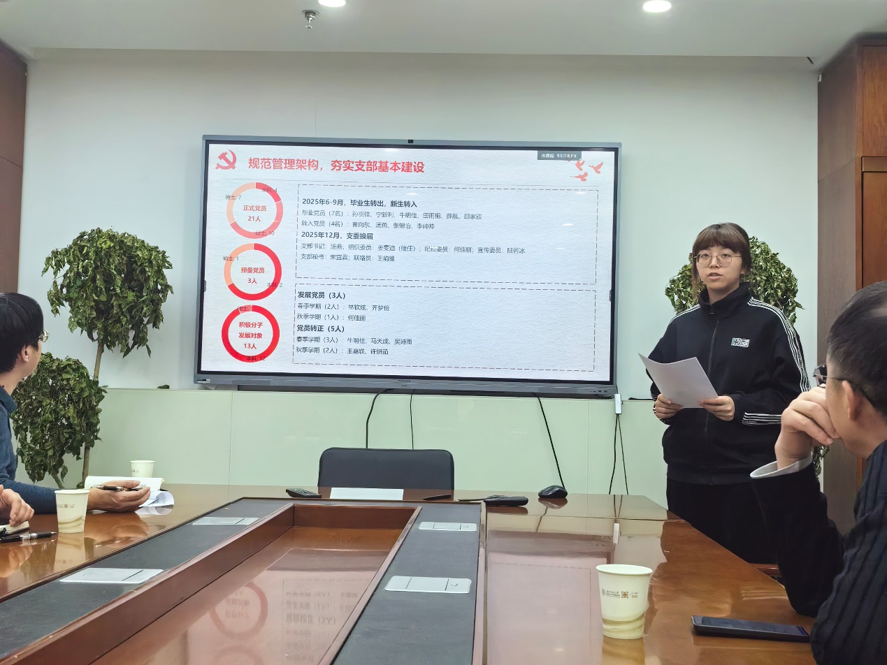 各党支部书记分别从主要做法和成效、存在主要问题和改进思路举措等三个方面对支部基本情况进行了汇报,突出深入学习贯彻习近平新时代中国特色社会主义思想特别是习近平总书记关于党的建设的重要思想、关于党的自我革命的重要思想,以高质量党建引领高质量发展情况,落实年度党建工作重点任务和月度组织生活指南情况,发挥党员先锋模范作用情况,落实立德树人根本任务情况,落实意识形态工作责任制和维护校园安全稳定情况,党支部书记及班子健全和完善党支部工作制度情况,同时回应了校内巡视、党建专项督查中反馈的问题,以及2024年度支部组织生活会查摆问题等的整改落实情况,让与会师生对各党支部书记履职尽责、党支部标准化规范化建设、党支部职能发挥等方面有了更为深入的了解。