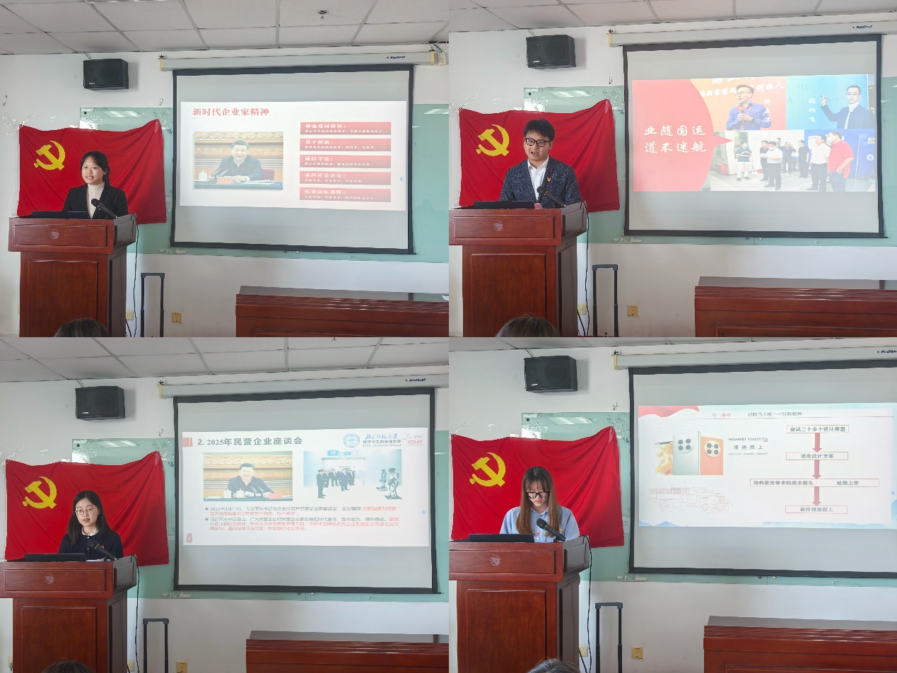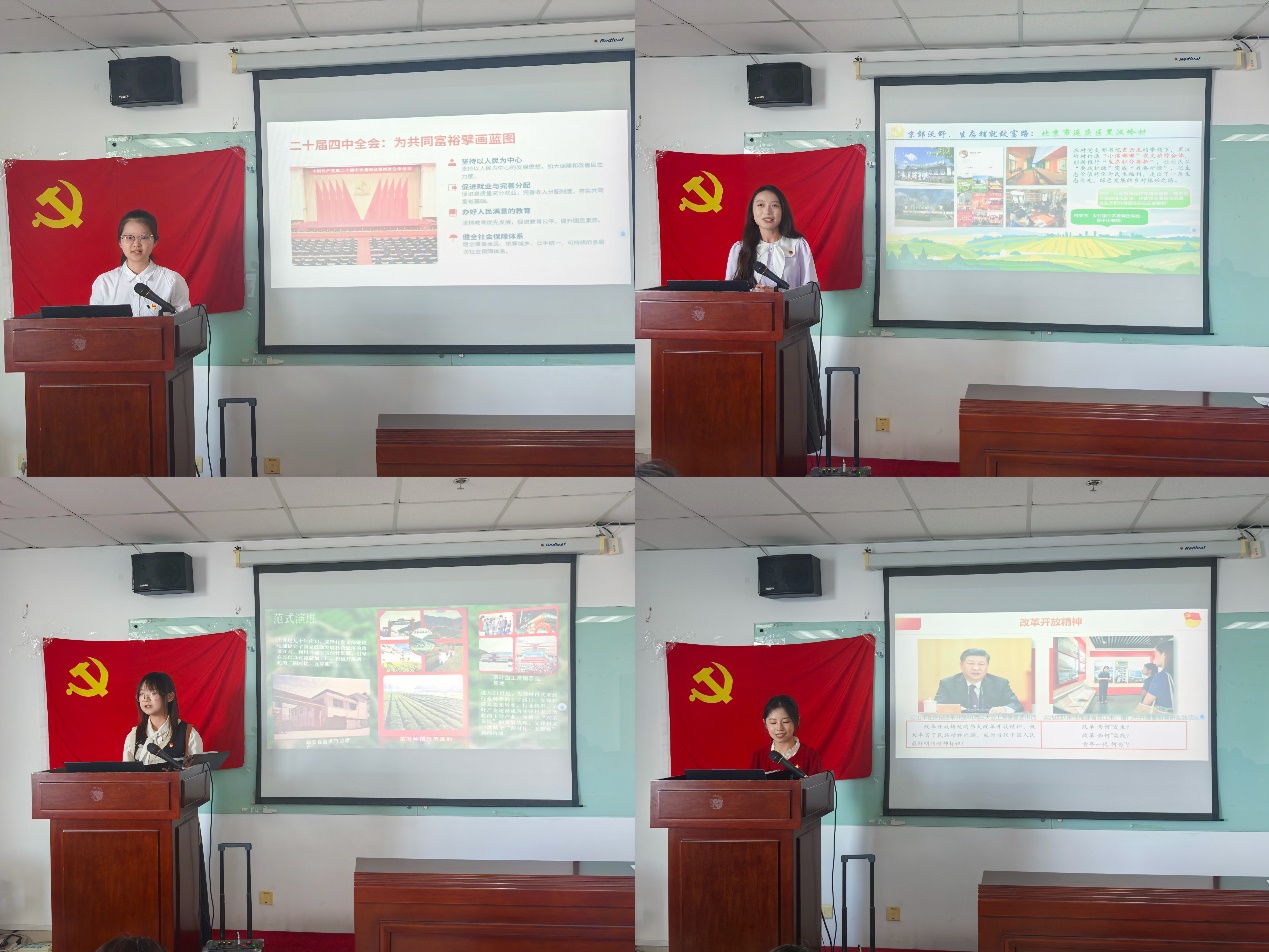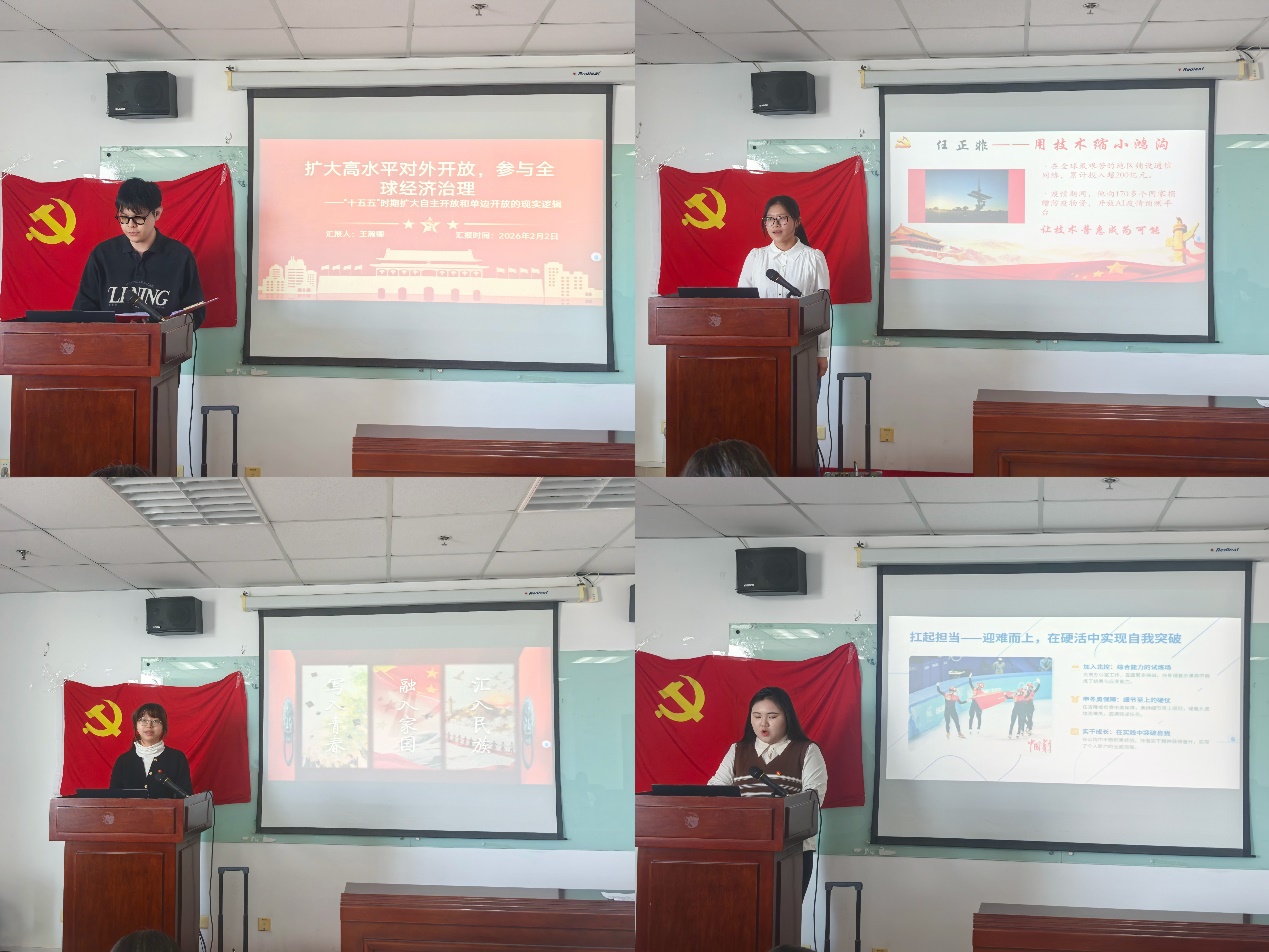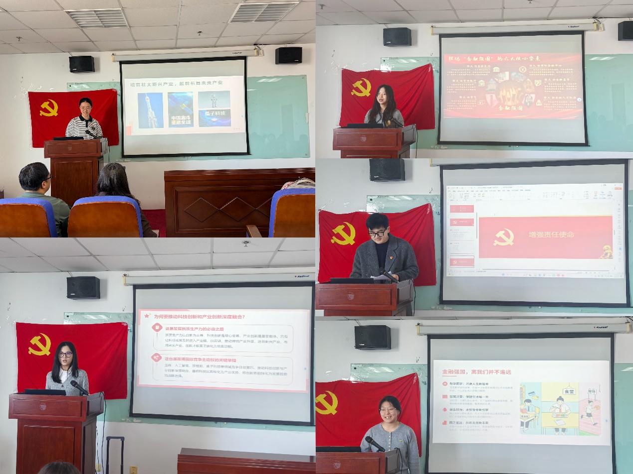 经济学第三党支部的蒋林静、经济学第四党支部的林琳,以《推动科技创新和产业创新深度融合,发展新质生产力》为题,生动讲述了推动科技创新和产业创新深度融合、发展新质生产力的实践路径;金融学第一党支部的兰紫馨以《党引金融潮,青春筑强国》、金融学第三党支部的王酉哲以《加快建设金融强国,增强高质量发展动力》、金融学第四党支部的王珈茜以《做好五篇大文章,推动金融高质量发展》,分别从不同角度讲述了加快建设金融强国、增强高质量发展动力的重要意义;国际贸易第一党支部的王瀚卿以《扩大高水平对外开放,参与全球经济治理》为题,阐述了扩大高水平对外开放、积极参与全球经济治理的时代内涵。