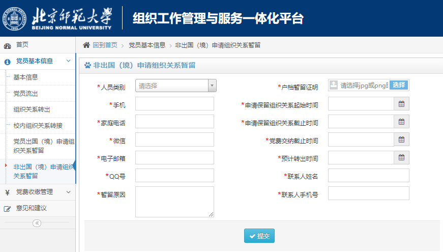 登陆公司组织工作管理一体化平台(http://zzbgz.bnu.edu.cn/,账号和密码同数字京师),提交党员组织关系暂留申请。