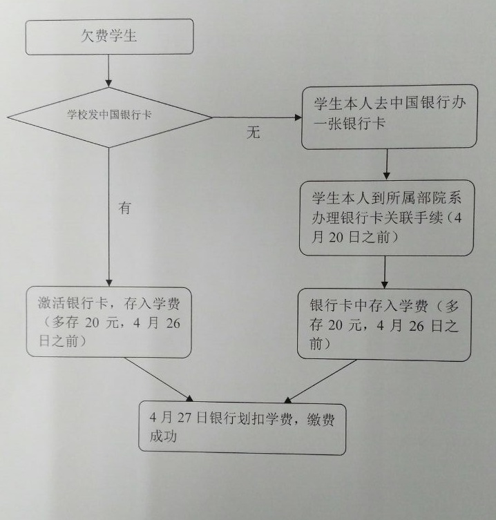 本次银行划账日期定于2015年4月27日,请各单位切实高度重视,并通知到每个欠费员工要求他们务必于4月26日之前将学费存入银行卡中。(如需办理银行卡关联,请员工于4月20日之前自行前往所属部院系办理关联手续。)
