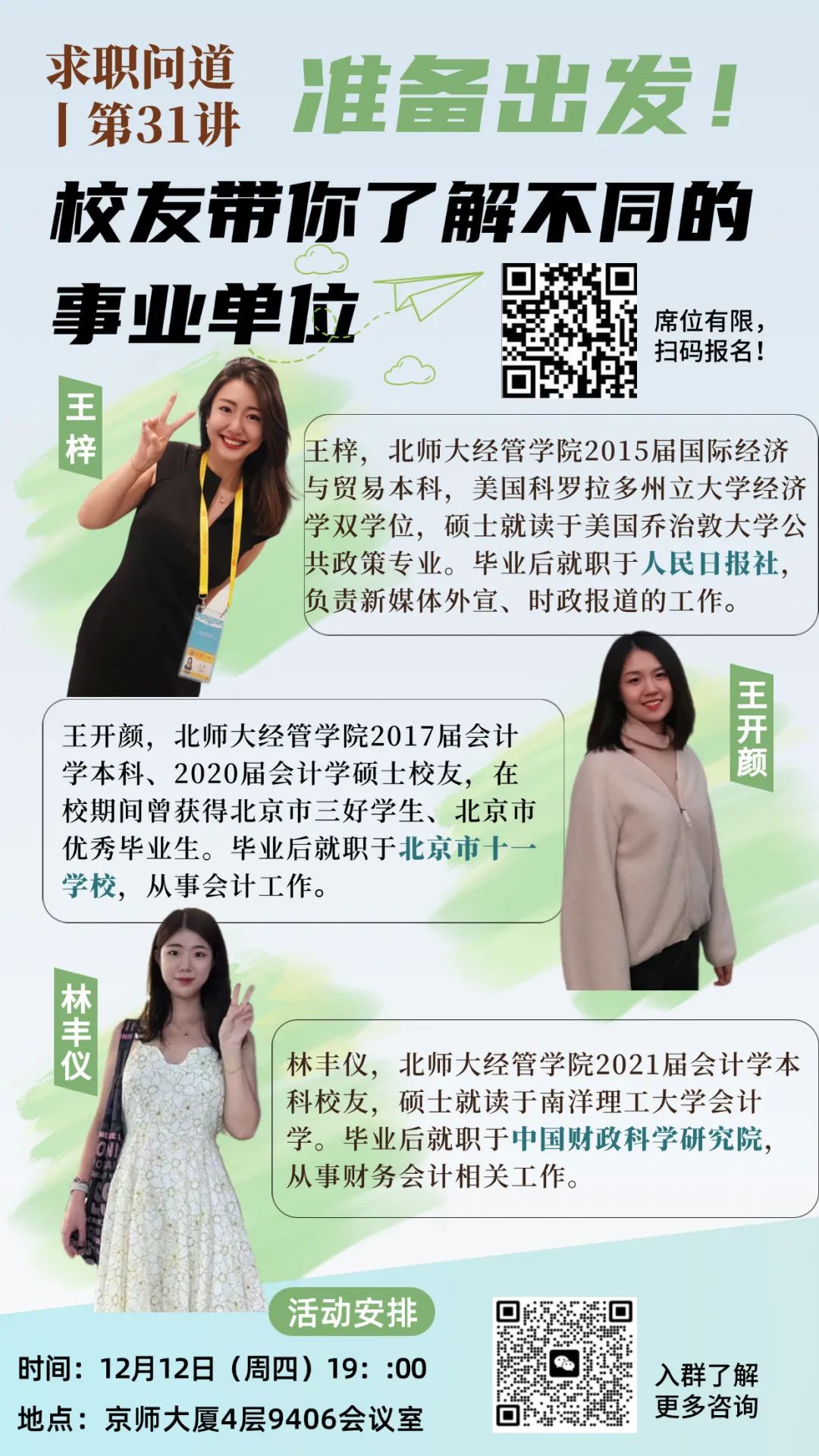 三位师姐来自不同领域的事业单位,特别是国贸和会计专业的同学一定不要错过,师姐们将为你讲述她们的故事,分享她们如何在求职过程中精准定位自己,做到所学专业与职业方向的高度契合。