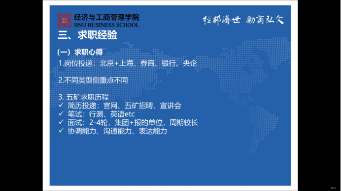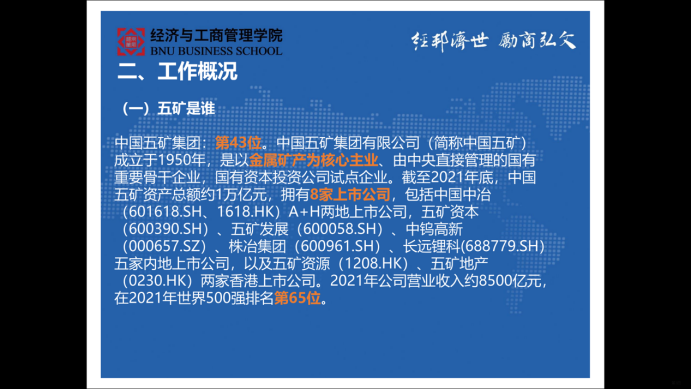 王立斌师姐首先对央企进行了介绍,说明了央企与国企的区别。随后在第二部分,师姐对她所就职的五矿集团进行了介绍,包括五矿集团的主营业务、行业地位、直管单位等,随后介绍了五矿集团内部“集团+直管企业”的组织架构,以及“四梁八柱”的业务体系,最后介绍了师姐所在的二级子公司五矿发展的工作内容与关联部门。在第三部分,师姐介绍了自己的求职经验,根据不同类型的岗位分别讲解了求职中不同的侧重点,并分享了自己的五矿求职经历,包括简历投递、笔试、面试和所需要的各种能力。最后,师姐对同学们提的问题一一进行解答。