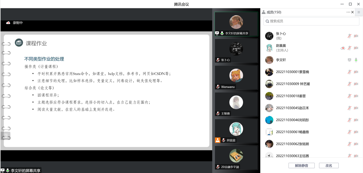 李文轩同学主要分享了学业进程、综合策略和课程作业三方面的内容:①李文轩同学以经济学专业为例进行了学业进程的分析,建议大家明晰个人发展目的,在学业与课外活动间找到自己的平衡点;②在综合策略上,建议大家从自身需求和未来职业规划出发合理规划时间和精力,分清优先级;③对于课程作业,可分为习题类、资料类、操作类和综合类四类作业分别以先复习课堂笔记后再处理习题和搜集处理大量数据进行完成等方法处理。