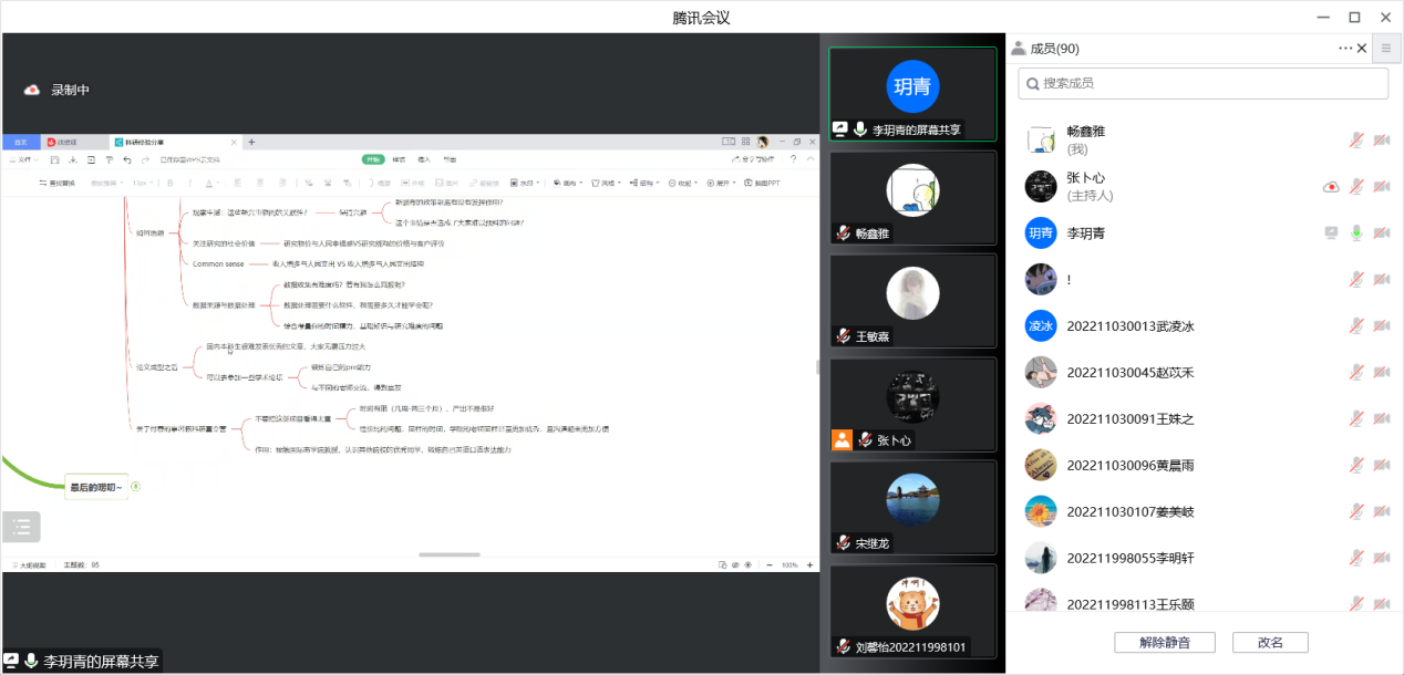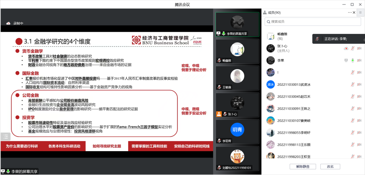 李果同学从为什么需要进行科研、本科生可进行的科研活动、如何寻找研究主题、需要掌握的工具和技能等方面进行了分享:本科生通过科研经历可以提升自己的研究型思维、数据搜集处理分析能力和论文表述能力等;本科生可以充分利用公司平台上提供的各种资源,勇敢尝试;同学们可以从专业领域出发,根据兴趣和社会热点选择自己感兴趣的内容进行研究,同时通过各种学习网站和数据库进行数据处理,珍惜每一次科研机会。
