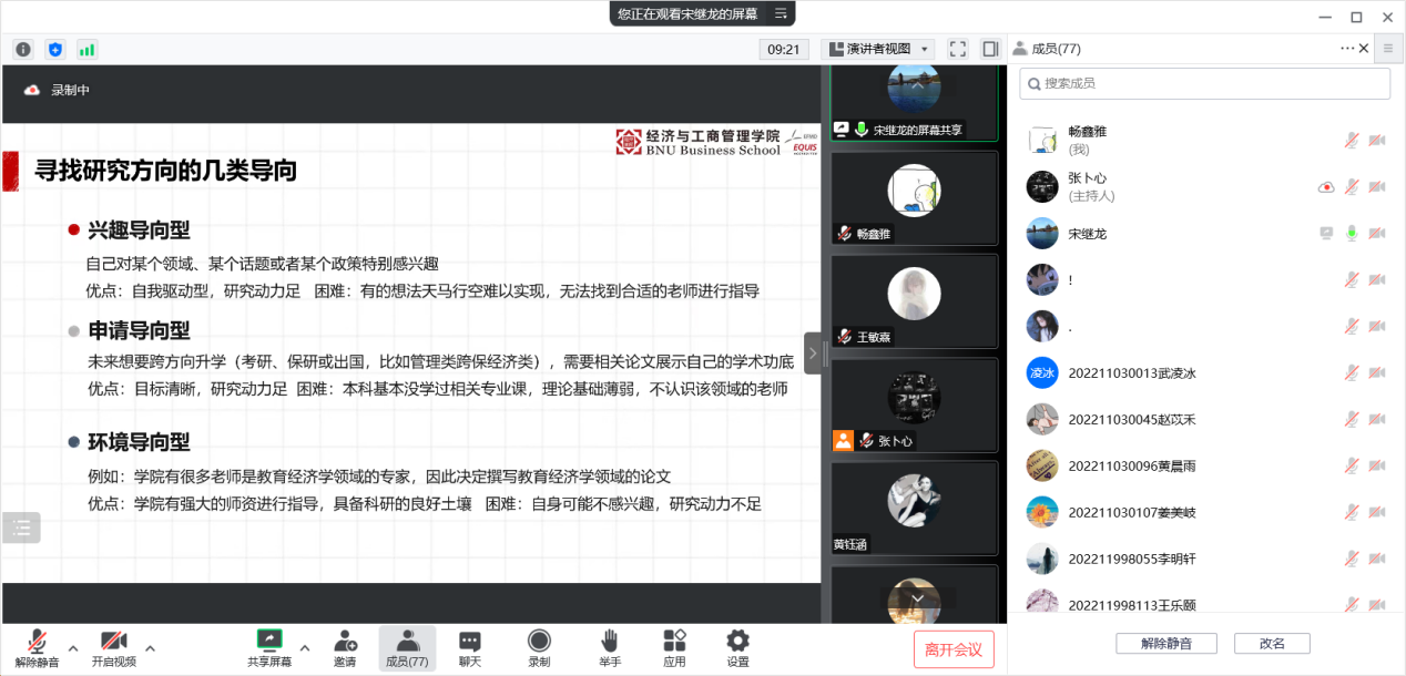 在分享过程中,宋继龙同学从什么是科研,如何入门科研,如何形成第一篇论文三方面进行了分享:首先介绍了论文的主要结构以及本科生主要需要锻炼的是一种能规范解决问题的能力;在学好专业课的基础之上由易到难,要克服由陌生和无知导致的恐惧心理,大胆尝试;至于如何形成第一篇论文,则要先确定研究方向,掌握一定的数据计量方法,合理利用各种资源资源来完成。