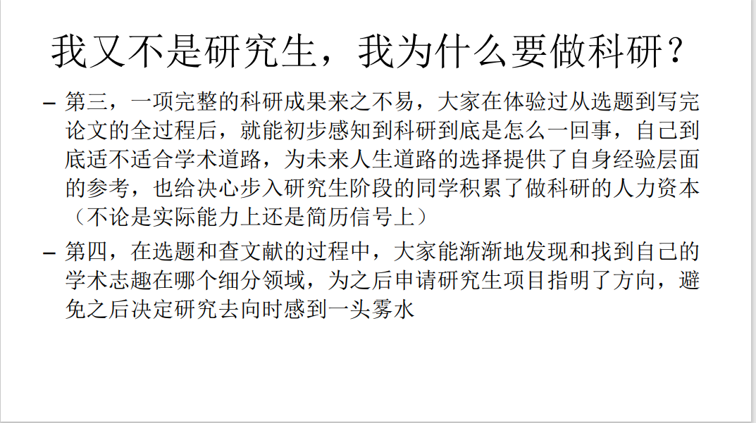 卫民同学从为什么本科生要做科研和如何做两方面来进行分享:首先科研可以巩固所学的专业课知识,对课堂学习进行补充还有助于确定自己将来的研究方向,可谓好处多多;对于如何做这个问题,首先要抓住锻炼机会,积极参加各种项目,其次可以积累经济学经验,尝试建立经济理论和模型并付诸应用。