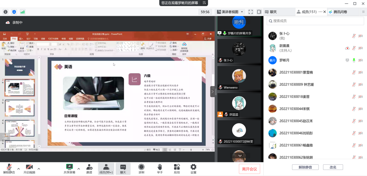 罗晰月同学从英语、数学和专业课方面进行了分享:①主要分享了日常课程和六级如何准备、针对听说读写如何练习等方面的经验;②数学方面主要以理解和练习两部分为主,课堂上需要认真听讲,课后则应该及时积极进行练习;③专业课方面,可以从预习、课堂、练习和复习四方面来进行学习准备。