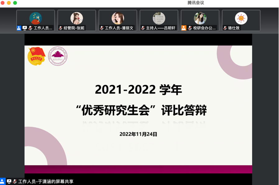 2022年11月24日晚7点,永利集团2021-2022学年“优秀研究生会”评选在线上举行。主席团成员张妮代表公司研究生会参与评选,按照抽签顺序,于第二个出场进行工作汇报。