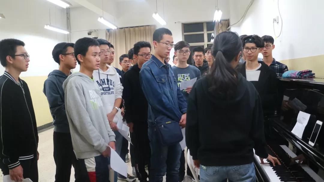 最后,便到了男女生四声部一起训练的阶段。为了不受其他声部的干扰,各个声部抱成团,让歌声在自己的小圈子里回荡、增强。由于男低声部人数少、曲调平,所以常常被其他声部带跑。但他们仍未灰心,在指挥和领唱的悉心指导下,在其他同学耐心的陪伴中,他们取得了极大的进步。
