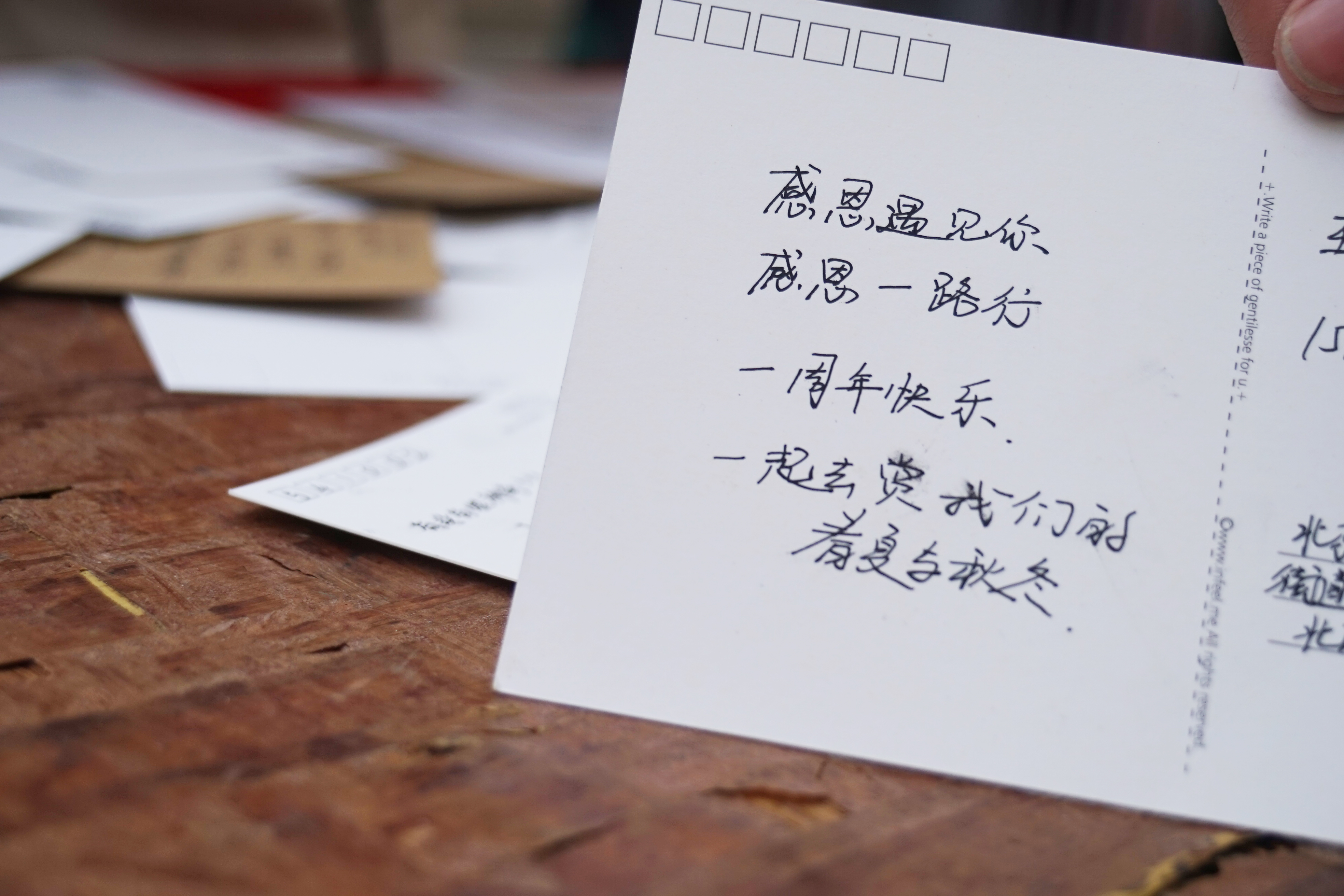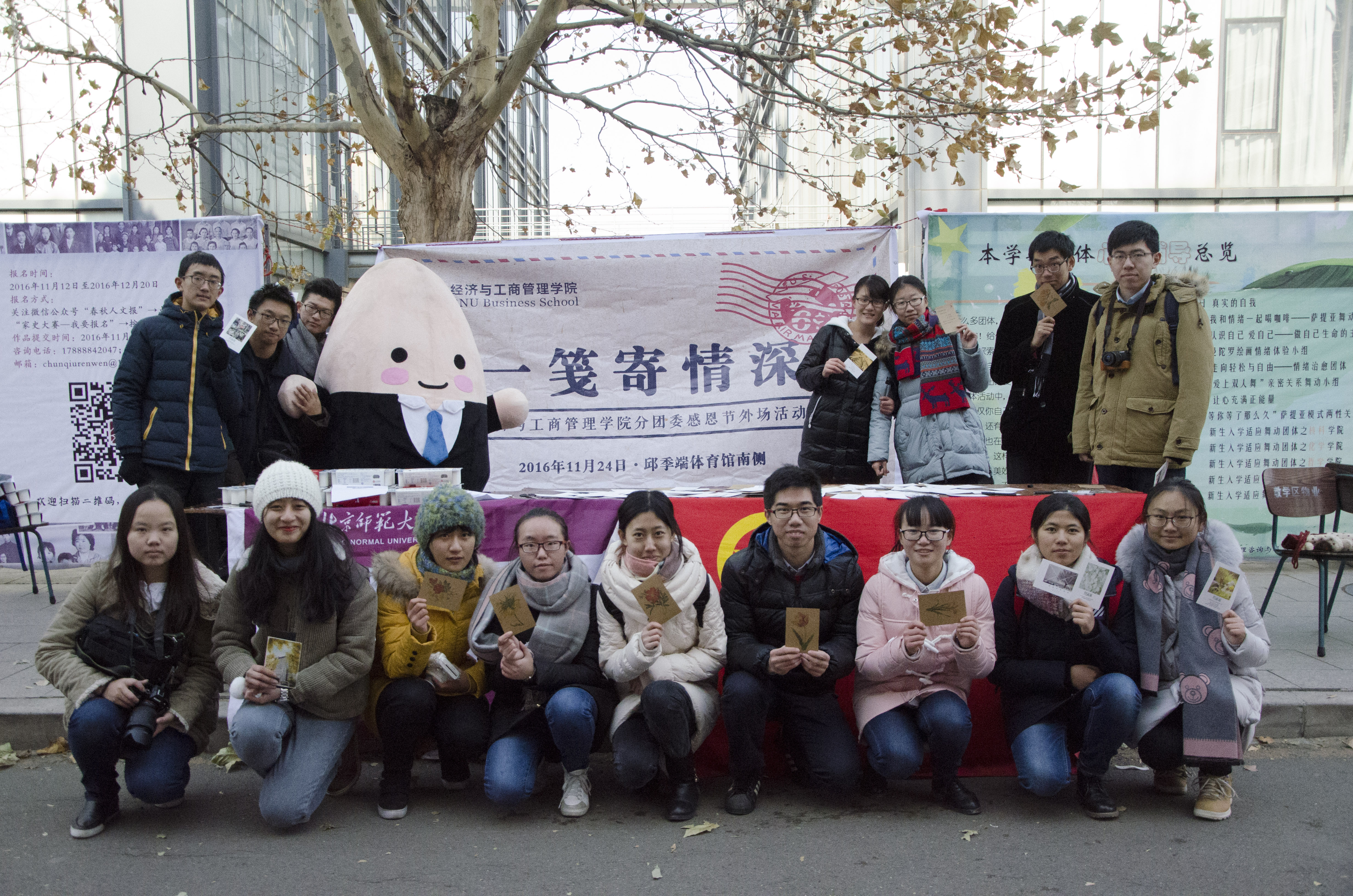 11月的北京,虽然室外寒风凛冽彻骨,但是在邱季端的南边,却洋溢着寒冬中的温暖。“一笺寄情深,经管分团委,感恩有你!免费寄感恩明信片,吃蛋糕喝酸奶!”路过的同学们看到吉祥物一颗糯米并听见了我们热情响亮的口号后,纷纷上前关注,拿起桌上的笔,挑选出精美的明信片为自己的亲朋好友写下了一句又一句温暖的祝福,距离阻隔不了心中的澎湃的感情,他们在内心深处埋藏已久的那句感恩之言已被一张张明信片带去远方。不一会儿,盛放明信片的纸袋便鼓囊囊的,装满了最真挚的祝福。
