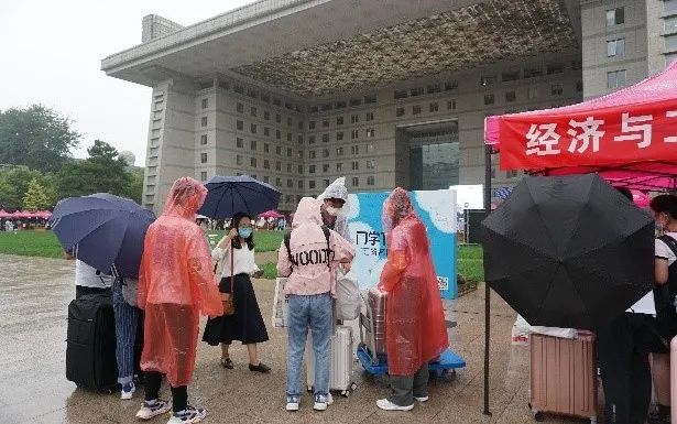 雨水并不能阻挡迎新工作。志愿者们披上雨衣,将新生送至宿舍楼办理入住。