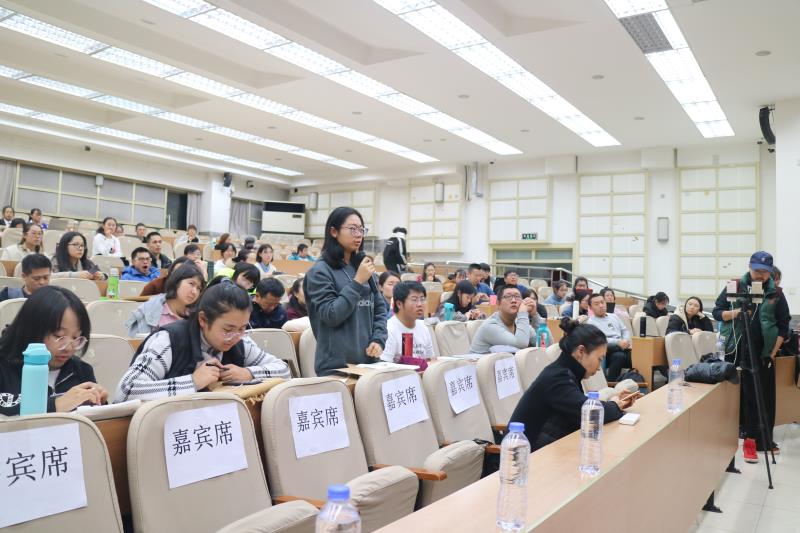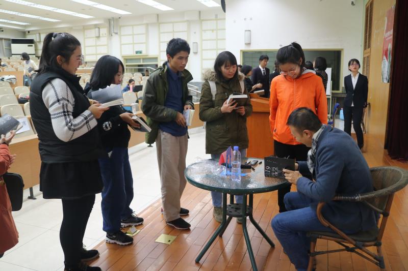 最后,是整场晚会的提问环节。同学们都很踊跃,提出了各种问题。比如,如何将真实案件消化转为小说中的文字,悬疑和推理的联系与不同等。也有慕名而来的外界人士举手发言,那多老师极富耐心,一一详尽作答。甚至对其中某些问题展开了长达四分钟的论述,现场同学和各界人士都收获颇丰。互动环节结束后,那多老师为同学们在自己的新书上签名,并与员工会的工作人员合影留念。