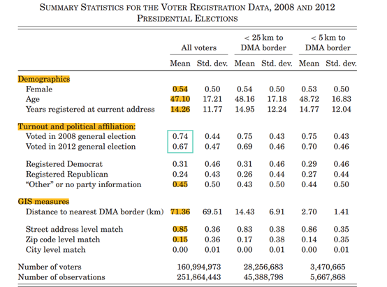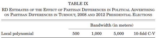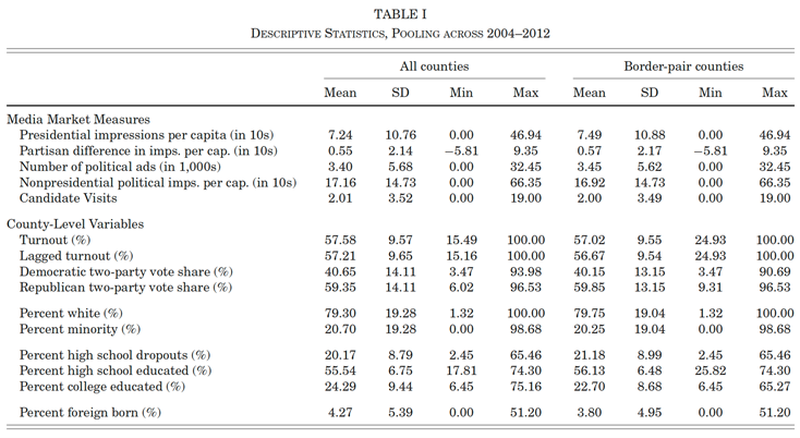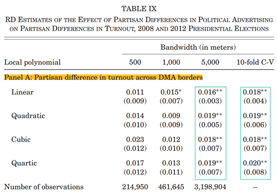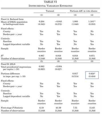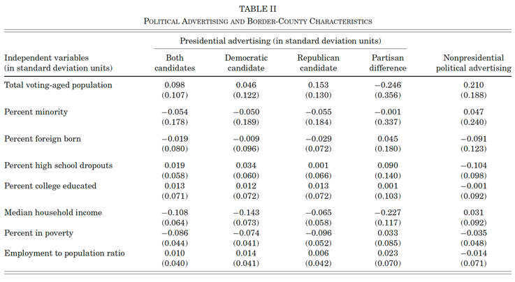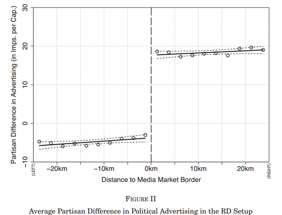 第二,文章利用相同州处于不同媒体市场的相邻县之间广告强度的空间不连续性来研究政治广告的影响,使得文章的因果识别具有一定的随机性,研究结果具有一定的可信度。