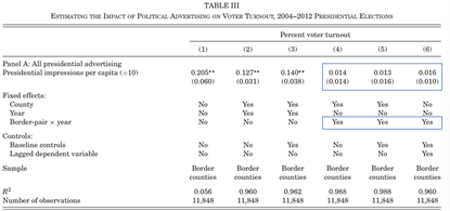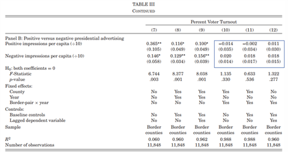 第二,与总体投票份额的结果相反,文章发现政治广告对候选人的投票份额的影响是相当大的。具体而言,两党广告投放差异增加一个标准差,即平均而言,公民看到一个候选人的广告比另一个候选人多大约22个,党派差异的投票份额就会增加约半个百分点。