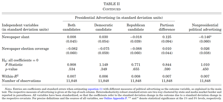 不论是单个广告位还是候选人所有广告的组合,计算出的说服率都比文献中报告劝说率小。因此,作者的研究结果与理论预测一致,即只要记者比竞选活动更少存在偏见,党派广告的效果应该小于倾向性新闻的效果。