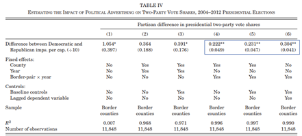 在本文中,作者研究了政治广告对选举结果的影响。作者的实证策略利用了FCC法规,这些法规导致了媒体市场边界上广告印象数量的变动。通过使用美国选民的县级数据和个人投票记录,研究发现广告通过改变选民的党派构成对选举产生影响。注册的党员更可能投票给自己党派的候选人而非竞争对手,这些构成上的变化对选举结果产生了显著影响。