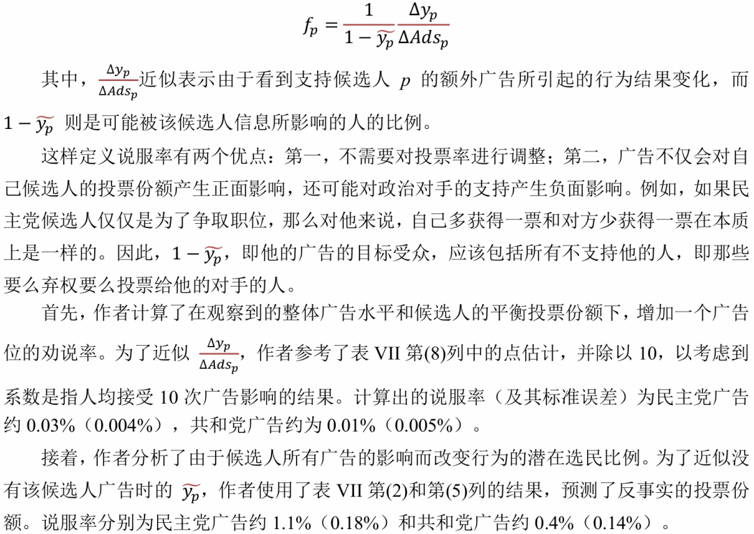 为了更好地理解政治广告对投票份额的影响,作者参考了DellaVigna和Kaplan(2007)的做法,重新计算了说服率。直观上,说服率衡量的是在接触特定信息后改变行为的人数比例。由于不同的研究使用不同的变量,并且在不同背景下,容易被说服的人的比例也不同,因此以下方式重新调整效应大小使其更具可比性。重新计算说服率的公式为: