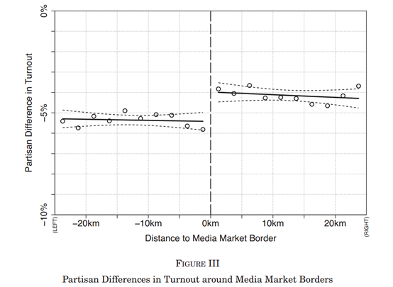Panel A中的数据是估计媒体市场边界上投票率的党派差异不连续性,即方程(4)中的 τ 。数值越大,表示相对于注册共和党人而言,注册民主党人的投票率增加。