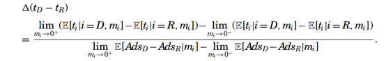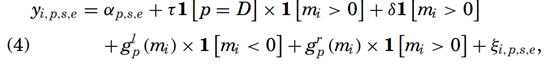 选民 i是一个民主党(其中 p∈{D,R}表示民主党或共和党)的注册支持者,并且居住在靠近边界段 s附近。指标变量yi,p,s,e表示在选举 e中,这位选民是否去投票。函数 glp(⋅)和 grp(⋅)是灵活指定的、针对各党派的多项式,并且允许它们在门槛两侧有所不同。为了控制未观测到的空间异质性,我们将每个 DMA(指定市场区域)边界划分为长度不超过10公里的段,并为每个党派和选举设置特定的固定效应 αp,s,e。研究的核心参数是τ。