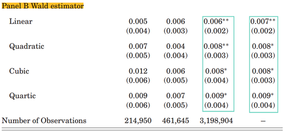 Panel B展示了党派差异在政治广告上的 Wald 估计值,即党派差异对投票率差异的影响(参见方程(3))。所有 Wald 估计值都经过调整,使得系数反映每人10次广告曝光对投票率的影响。