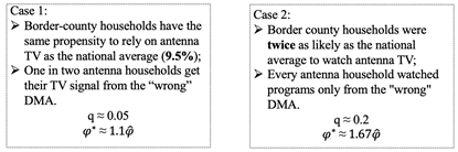 在以上的分析中,作者潜在假定广告强度没有测量误差。但是,如果相当数量的家庭从邻近的媒体市场观看电视台,则本文的分析可能会高估广告强度。假设占比为q的家庭从邻近的媒体市场接收电视信号,则选民看到的实际广告数量为,