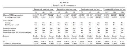 平均而言,边界县人口占总体DMA人口的5%。由于政治广告是在DMA水平上购买,政治广告的投放量和投放策略是DMA层面的因素决定的,因此单个边境县对其只有很小的影响。当这个前提成立时,基于以下计量模型可以推断政治广告对选举结果的因果效应: