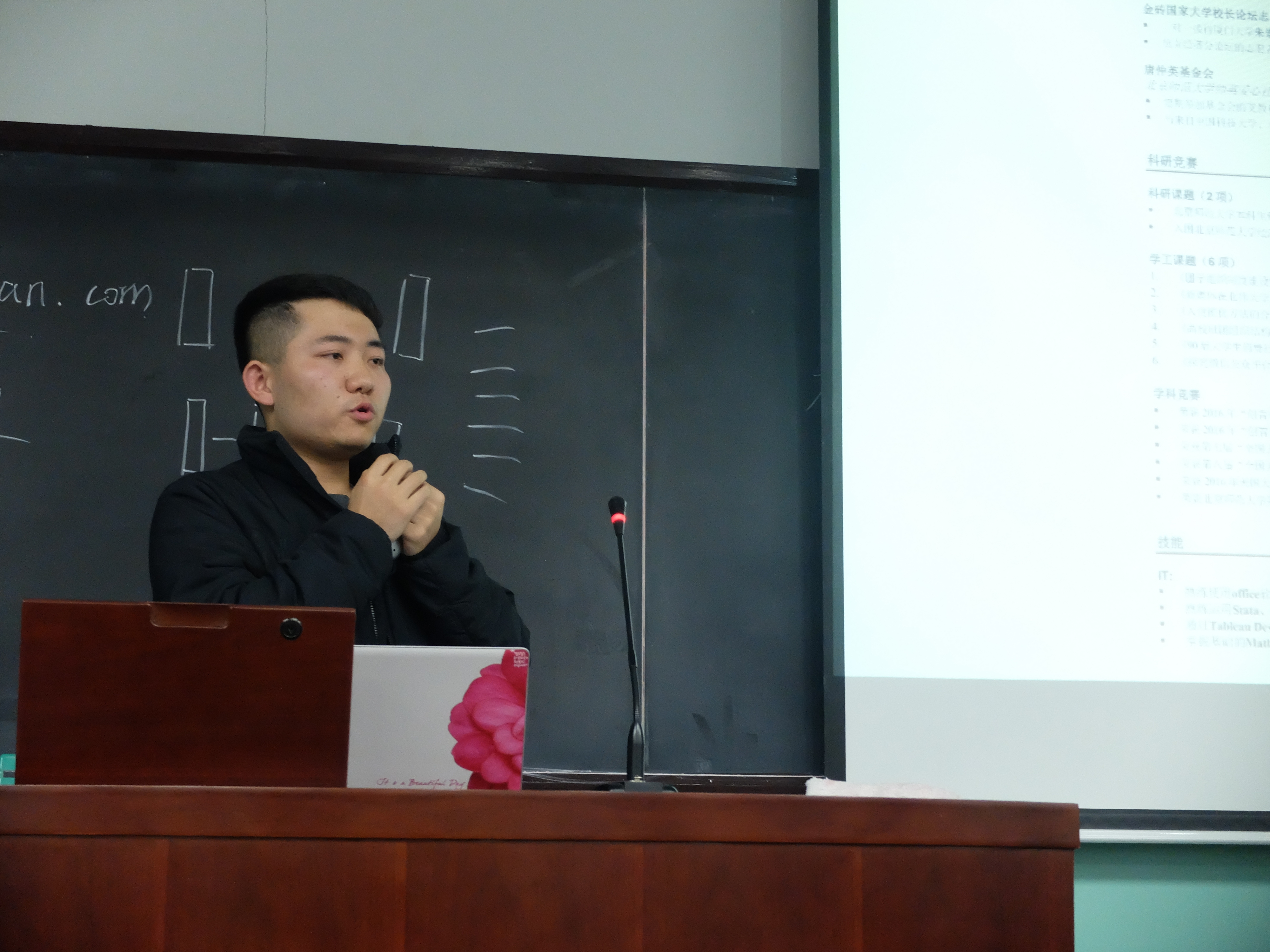 八点整,在一片期待的目光中,首次“干货放送”拉开帷幕。简短的开场白后,主持人介绍了本次讲座的三位主讲人:2015级硕士生、现北师大经管院会研究生会主席刘赫,2013级本科生、现华福证劵北京投行总部实习生肖本志,及2015级本科生、曾参与第十六届未教赛整个筹备过程的贾思源。
